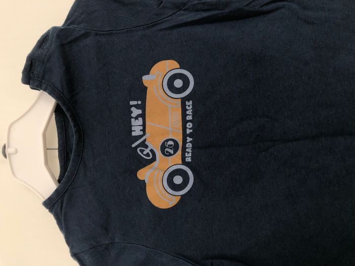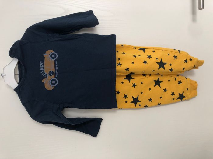 Ensemble garçon, 2 pièces, composé d'un haut manches longues et d'un pantalon élastiqué à la taille. Motif voiture et étoiles Marque Kiabi (haut) et Ergee (bas) Taille 18 mois