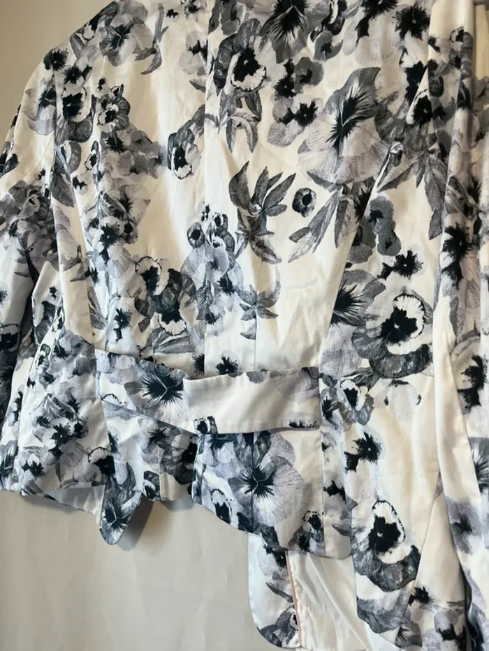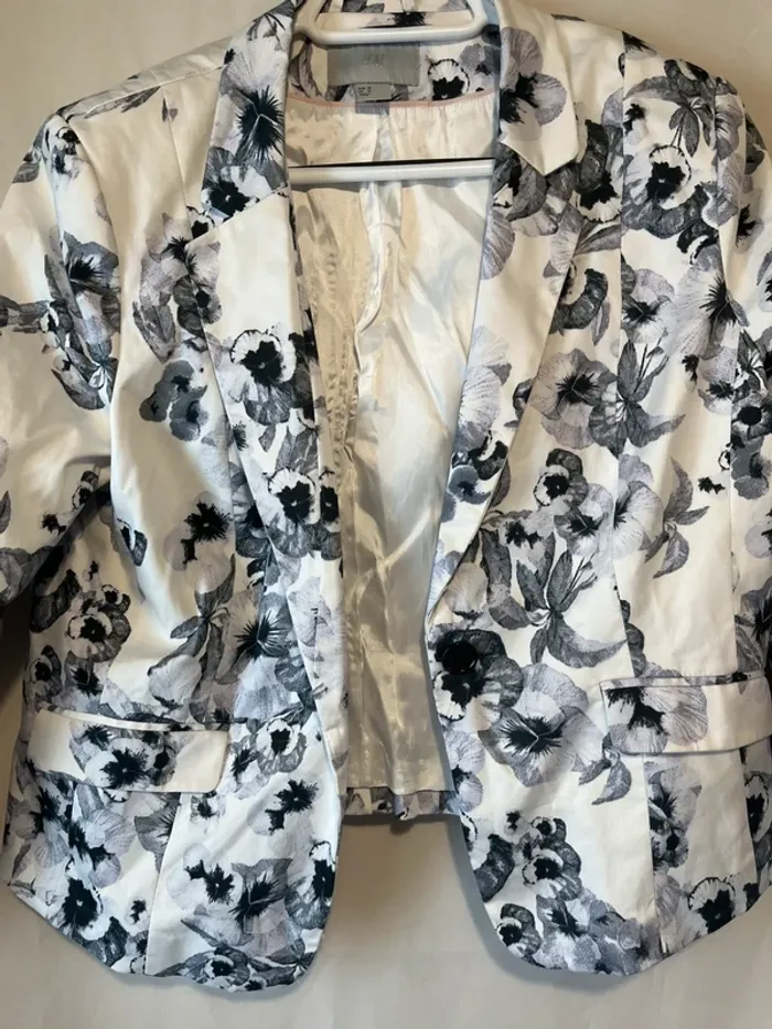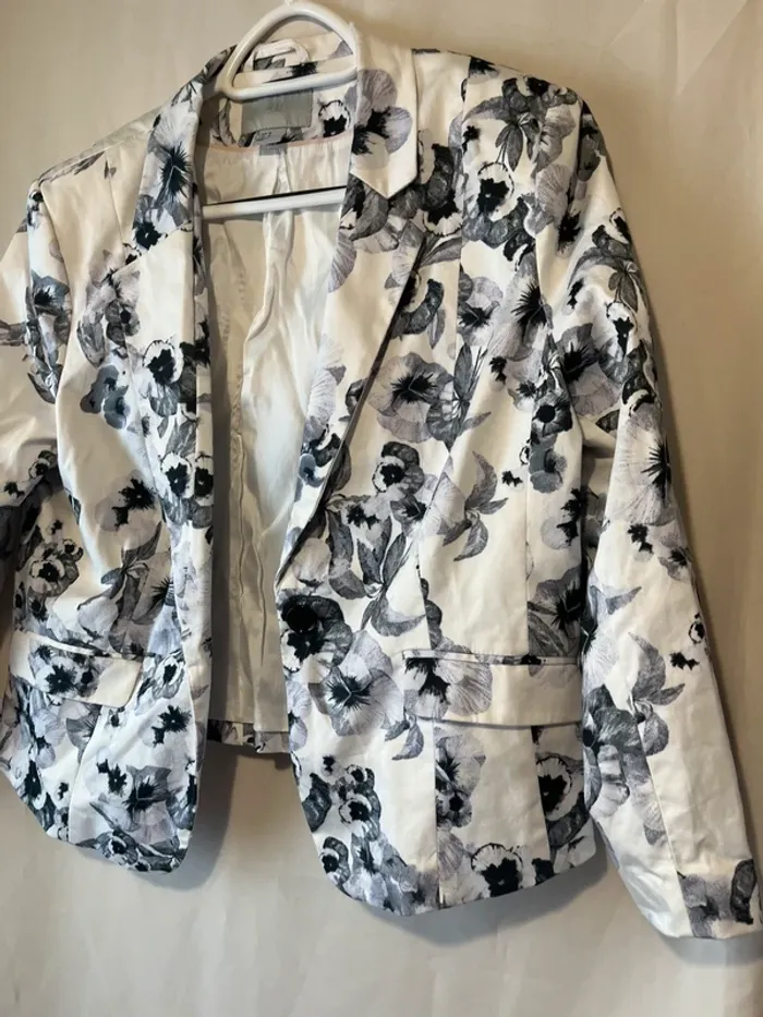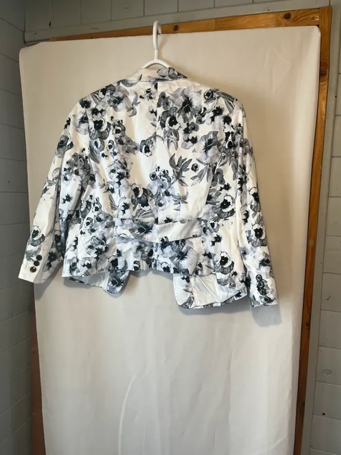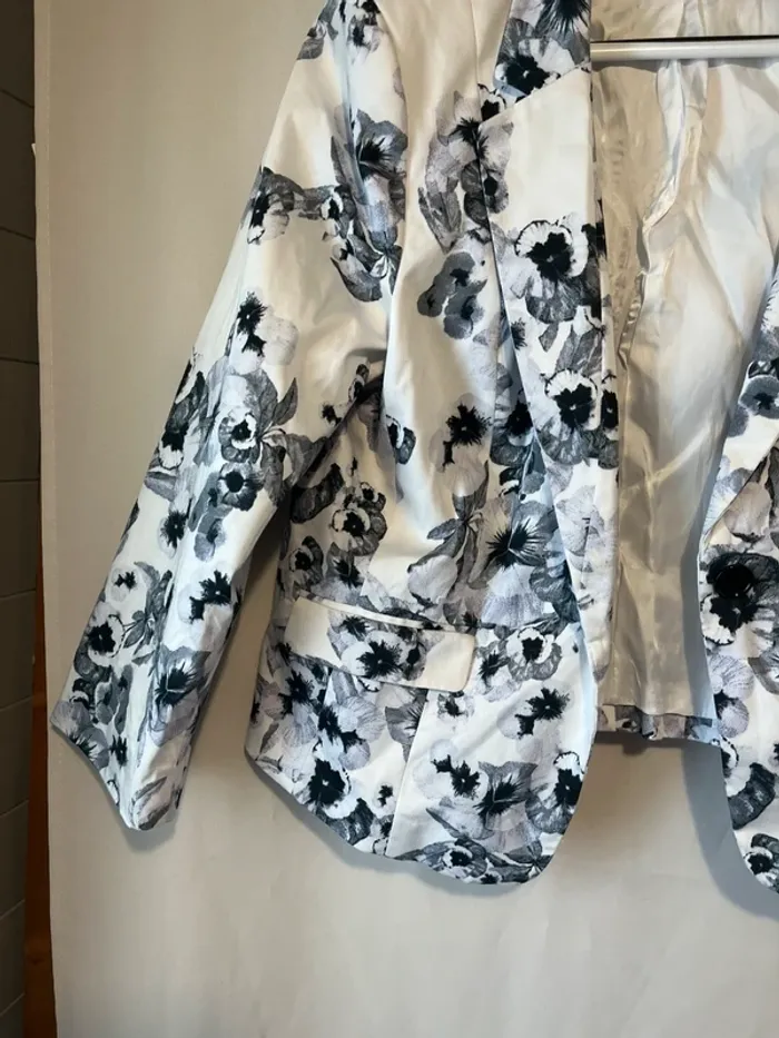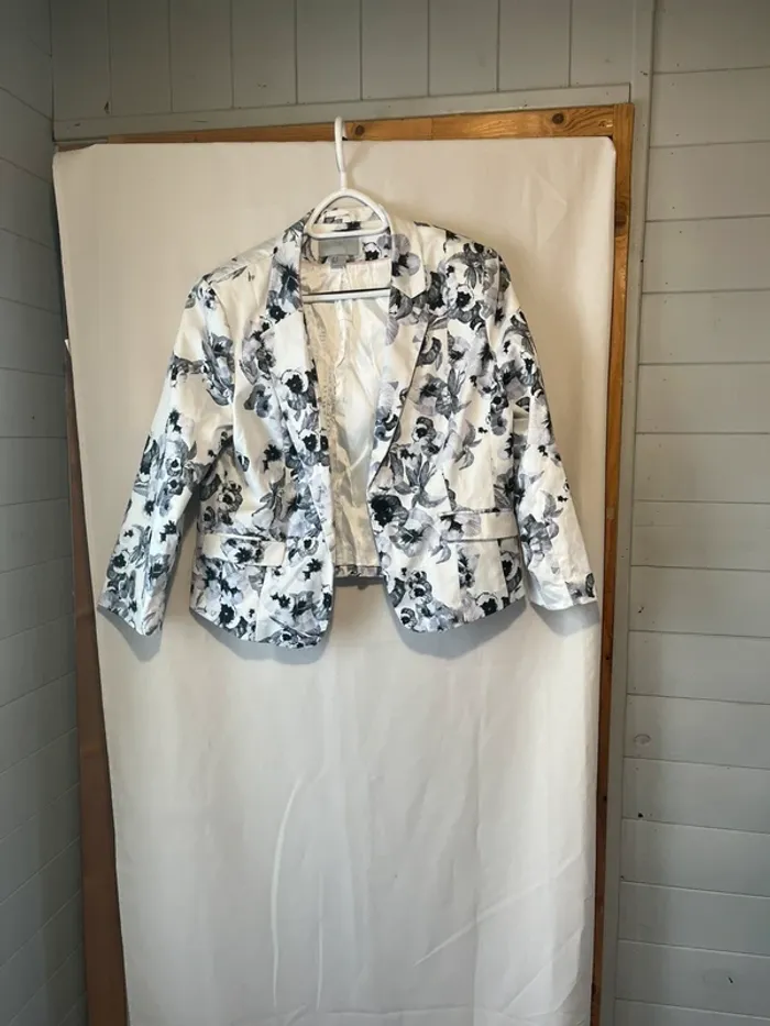 Veste blazer Blanc imprimé fleurs Taille 44 Manches 3/4 Poches Mesures correspondantes avec la dernière photo : A 43 cm B 55 cm C 49 cm D 58 cm