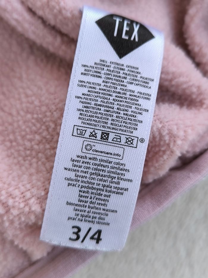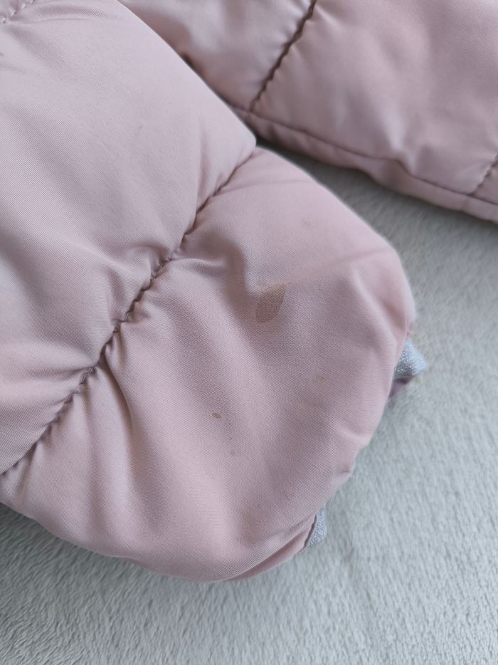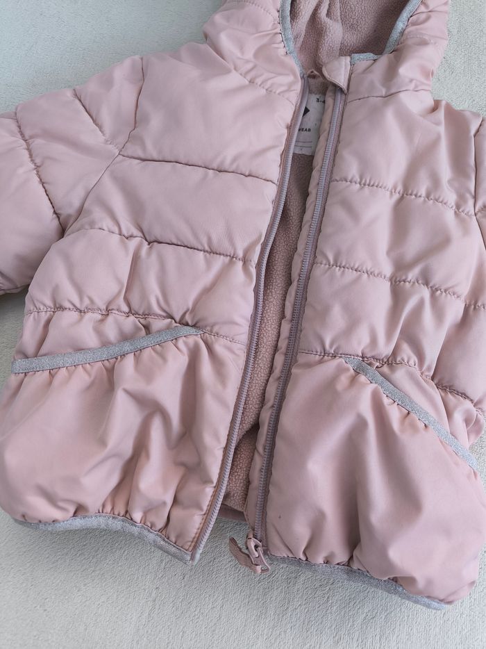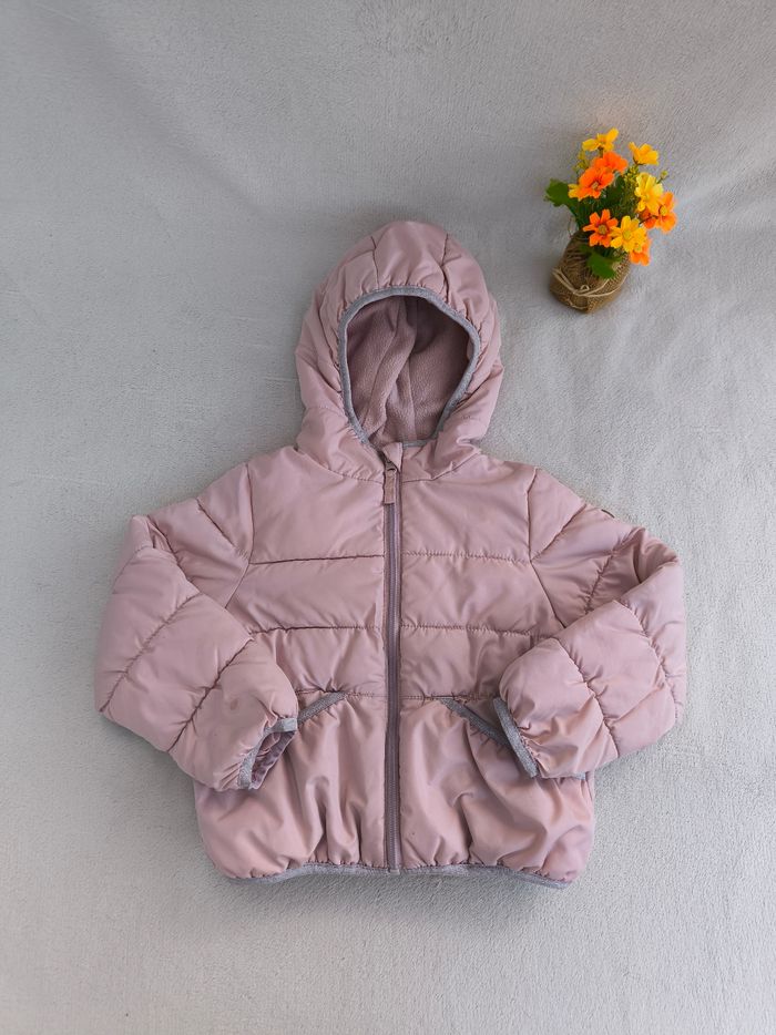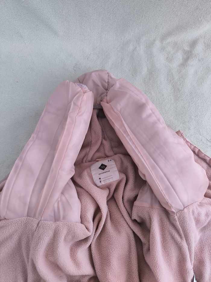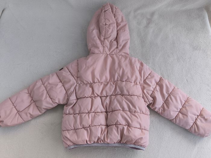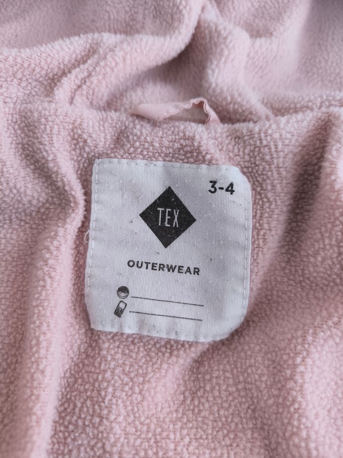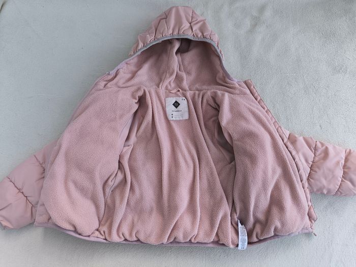 Manteau / Doudoune à capuche et à manches longues Marque Tex Taille 3-4 ans • Coloris rose, argenté • Intérieur polaire • Fermeture par fermeture éclair • Bas des manches élastique • 2 poches • Bas d'une manche taché, petite taches sur la veste En état satisfaisant #evelyne_filles_3ans #evelyne_filles_4ans #evelyne_filles