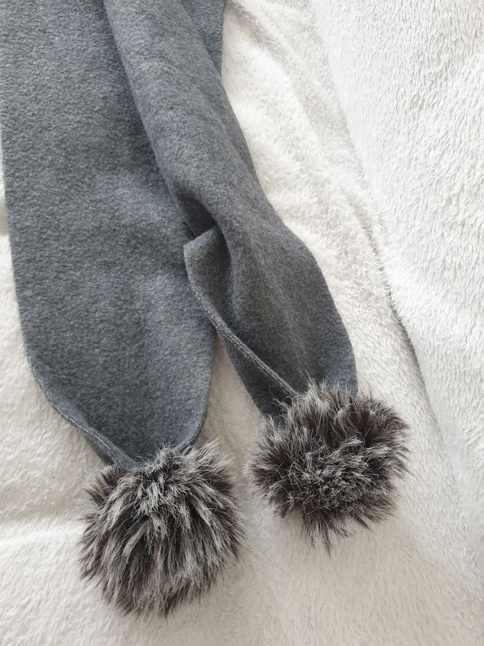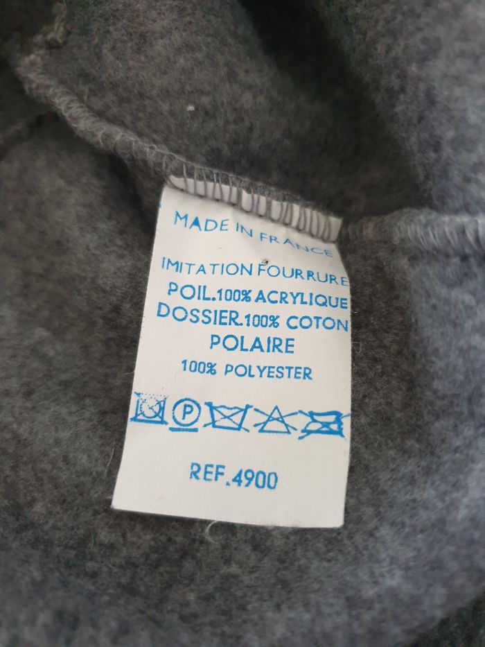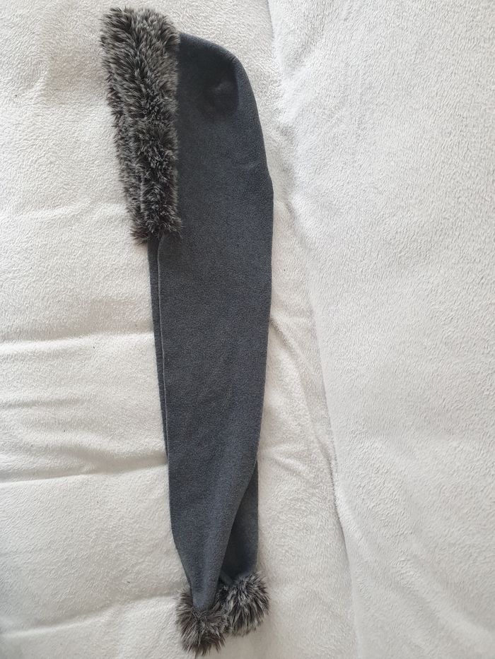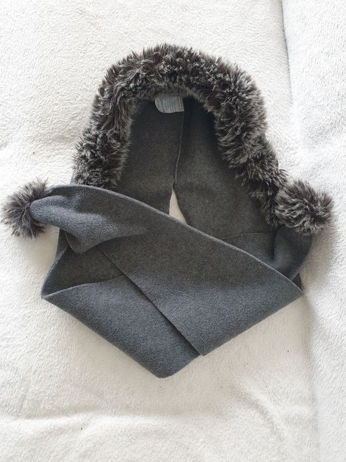 Bonnet écharpe a pompons. Gris. Vintage. Made in France. Imitation fourrure. Poil 100% acrylique. Dossier 100% coton Polaire 100% polyester. Ref 4900. Parfait état.