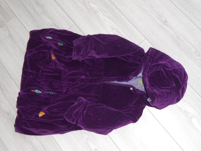 Très joli manteau en velours avec capuche non détachable fermeture éclair + boutons pressions tissu extérieur : 100 % coton doublure : 100 % polyester garnissage : 100 % polyester Motif : feuilles cousues Age : 23 mois