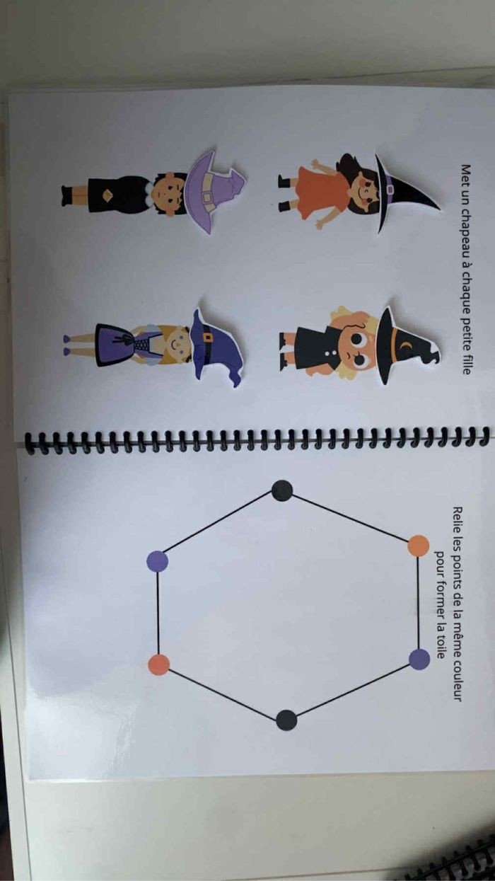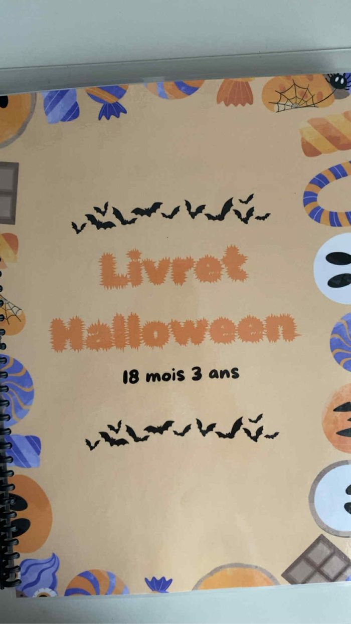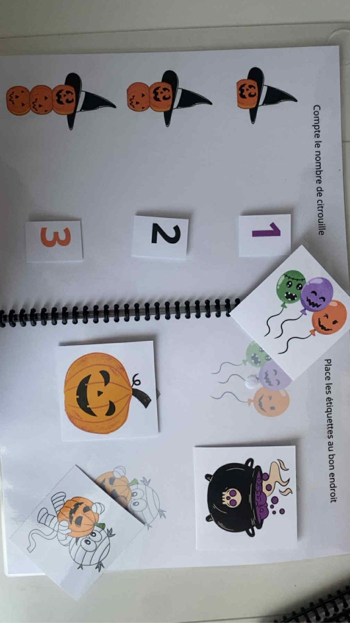 livret d'activités Halloween pour enfants de 18 mois à 3 ans, parfait pour apprendre en s’amusant. Il est relié et plastifié pour une utilisation infini , avec velleda et pochette de rangement pour les étiquettes