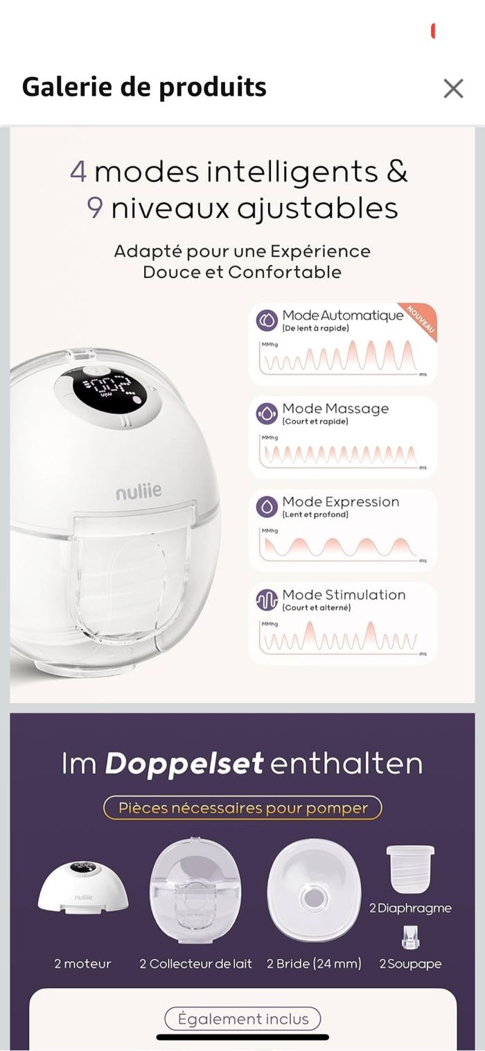 Tire lait mains libre de la marque nuliie A servi un mois fonctionne très bien. Léger impact sur un des deux. Peut être fourni avec des poches de recueil de lait sans supplément , car je n’en ai plus besoin. Prévoir d’acheter des téterelle en fonction de votre taille de mamelon