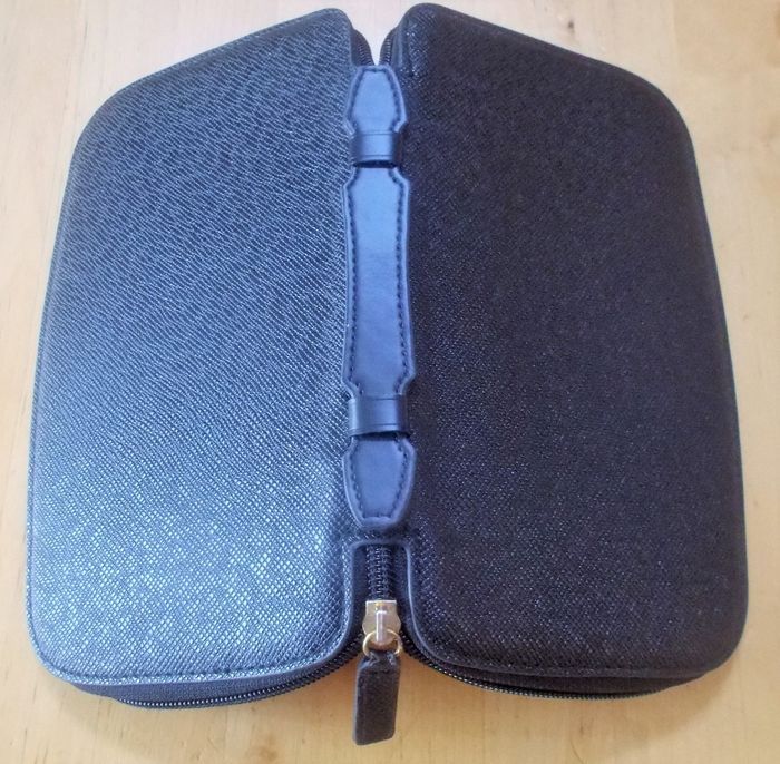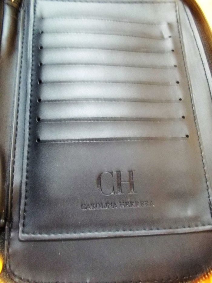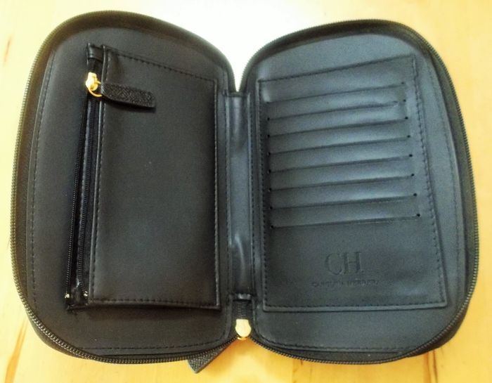 Pochette à cartes "Carolina Herrera", aspect cuir noir strié, compartiment porte monnaie, cartes, etc, fermeture zippé, dimensions : 20 cm x 12,5 cm, 2 cm, jamais utilisé.