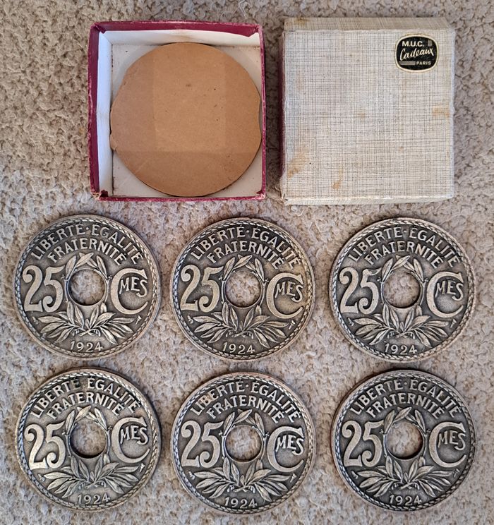 🍽 Lot de 6 sous-verres représentant une ancienne pièce de 25 centimes de 1924, mesurant 8cm de diamètre et pensant 98g chacun, en boite 🛠️ État : bon (voir photos pour plus de détails) 📦Envoi rapide, suivi et soigné 🤝 Vente directe possible sur Berck (62600) ➡️ Intéressé(e) par plusieurs articles ? Regroupez vos achats pour économiser sur les frais de port ! 📩 Besoin d'infos supplémentaires ? Je suis dispo, n'hésitez pas ! Broc'Ant – Jouets • Jeux Vidéo • Brocante • Objets de Collection #brocant #brocantdeco #vintage #collection #retro #ancien #brocante #vaisselle #dishes #dessousdeverre #sousverre #sousbock