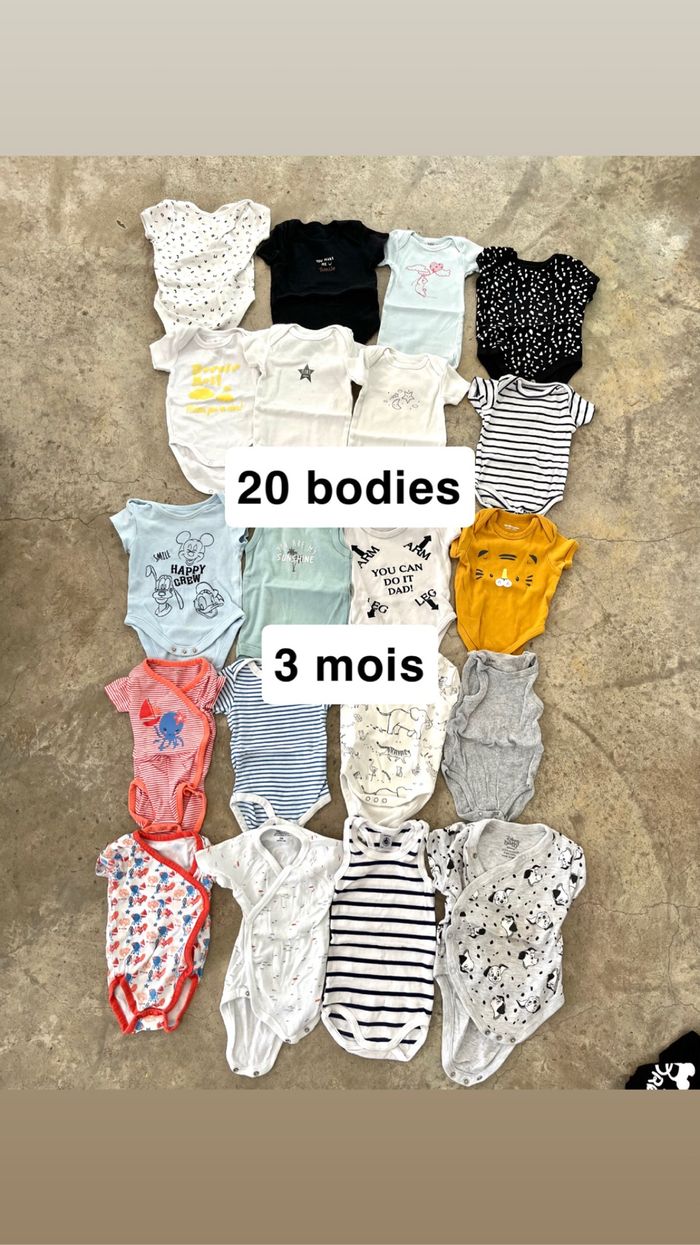 Lot 20 bodies 3 mois. D’autres vêtements disponibles sur mon profil ou d’autres articles pour bébé. Envoi très rapide. Allez sur mon profil pour faire un lot. Le prix n’est pas négociable. Merci.