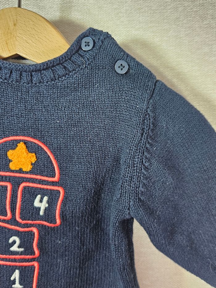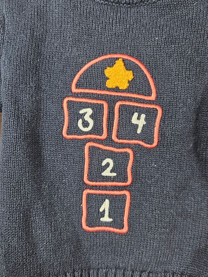 Un adorable pull en maille bleu marine, orné d'un motif ludique de marelle, parfait pour un look à la fois doux et original.