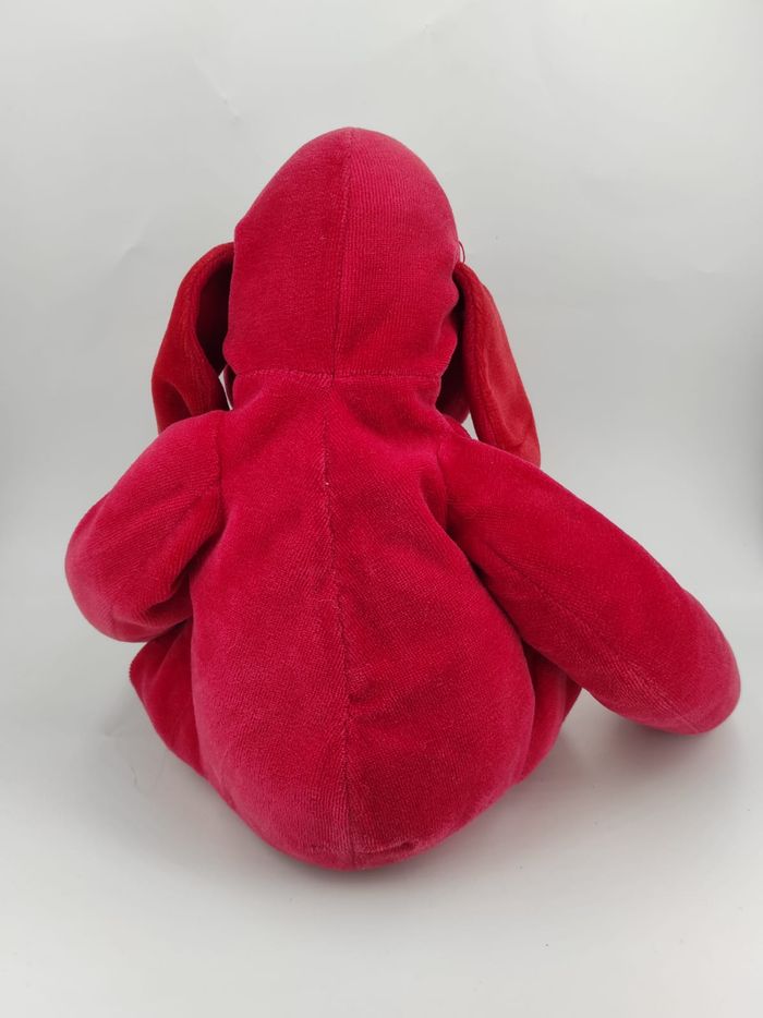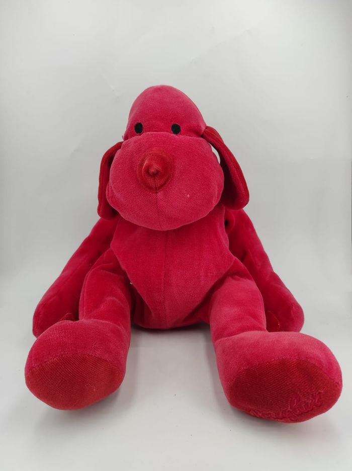 🐶 Doudou Chien Rouge avec Scratch au bout des mains et inscription Douglas brodée sur le pied.