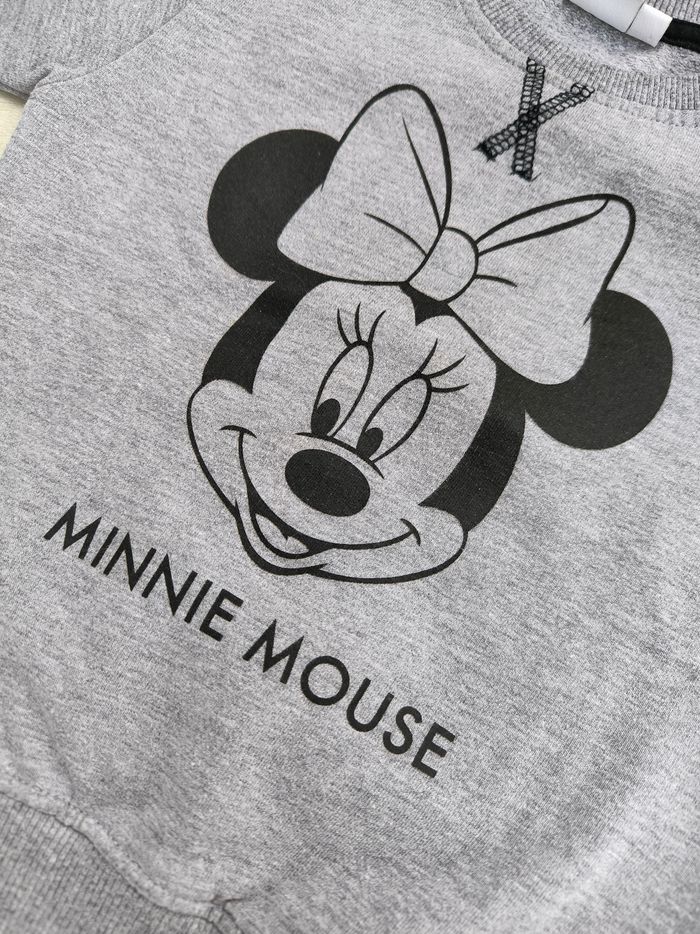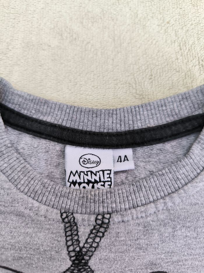 Sweat à manches longues Marque Disney Taille 4 ans • Coloris gris, noir • Imprimé tête, inscription "Minnie Mouse" • Col rond • Coton fin • Petites taches, bas des manches marronnés En bon état #evelyne_filles_4ans #evelyne_filles