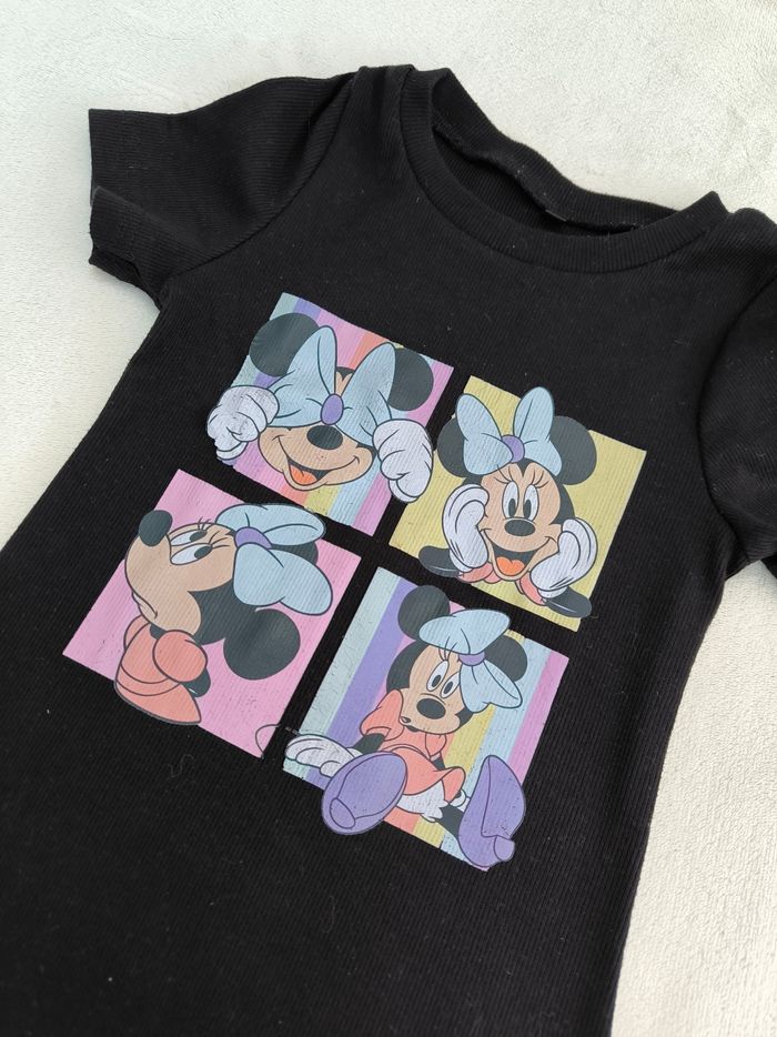 Robe à manches courtes Taille 4 ans • Coloris noir, multicolore • Imprimé Minnie Mouse • Col rond • Côtelé • Imprimé craquelé, quelques bouloches En bon état #evelyne_filles_4ans #evelyne_filles