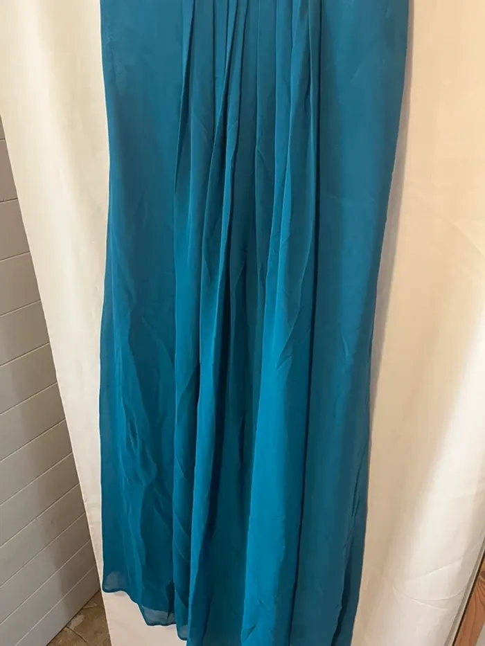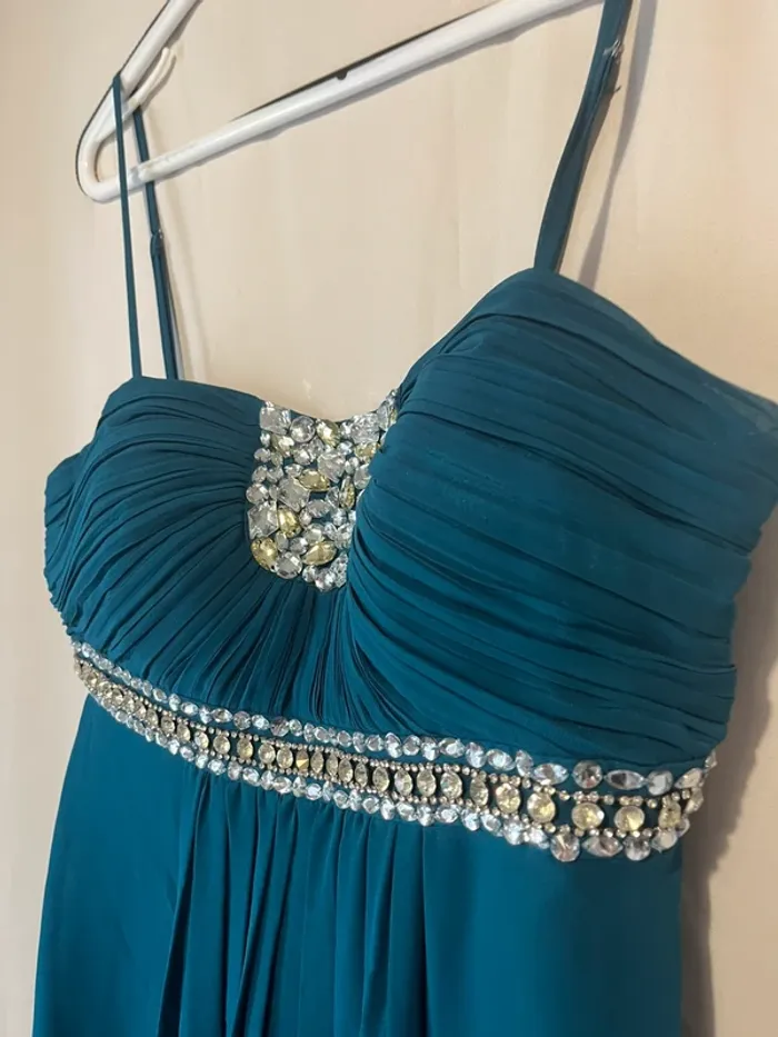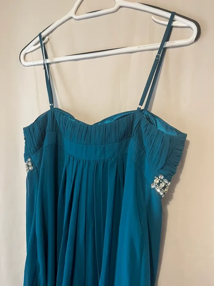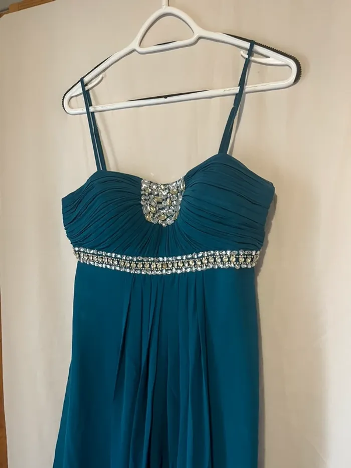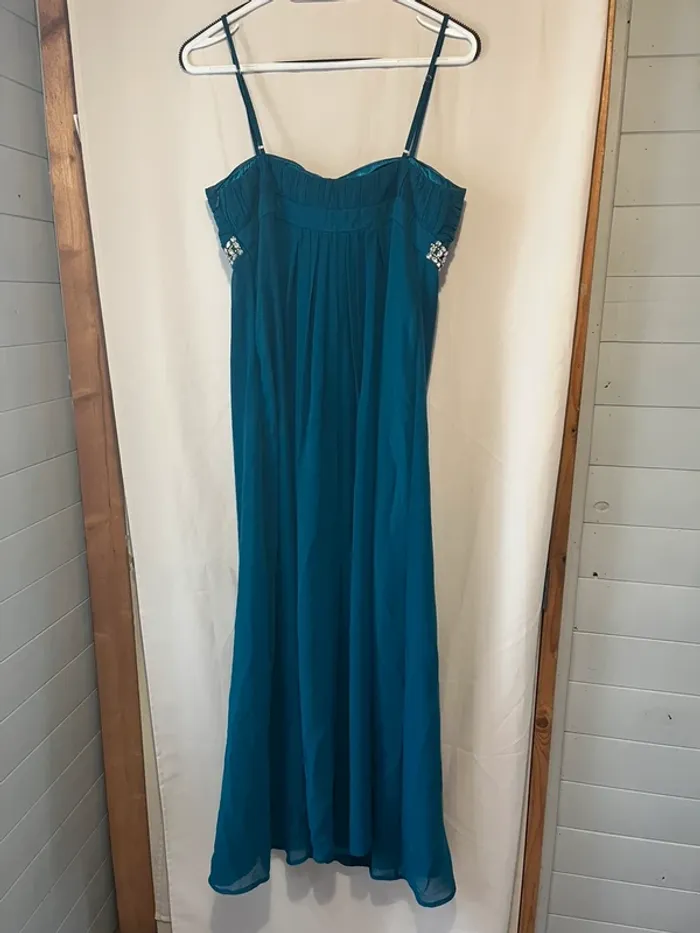 Robe longue de cérémonie Bleue pétrole Taille 42 Strass Bretelles réglables Aisselle à aisselle 44 cm Longueur 140 cm