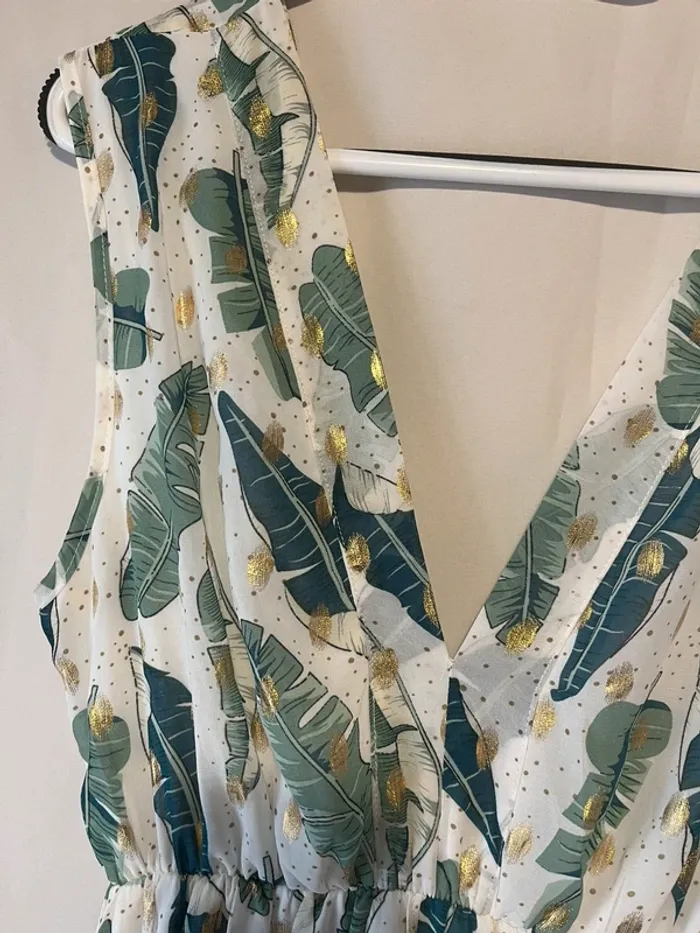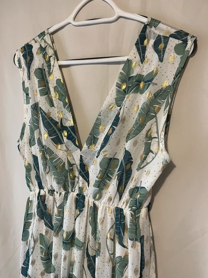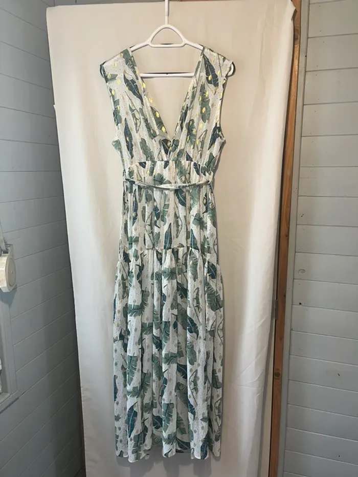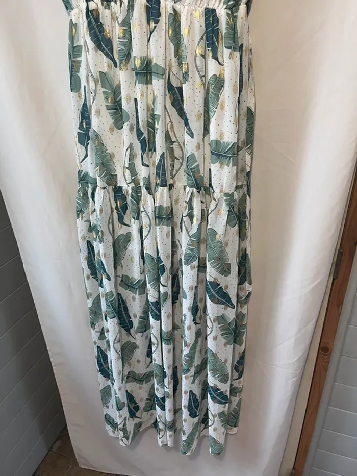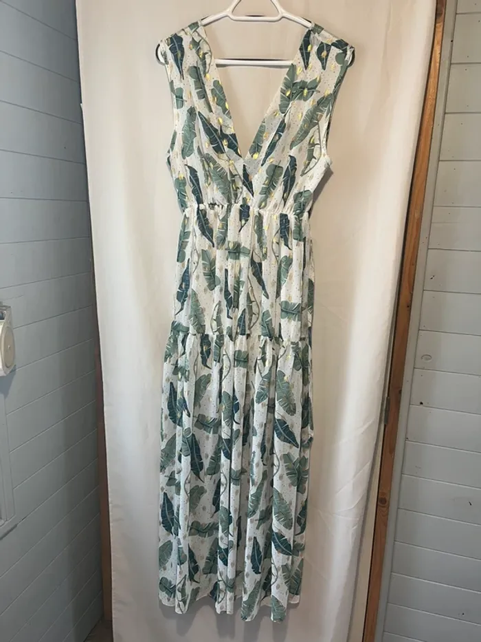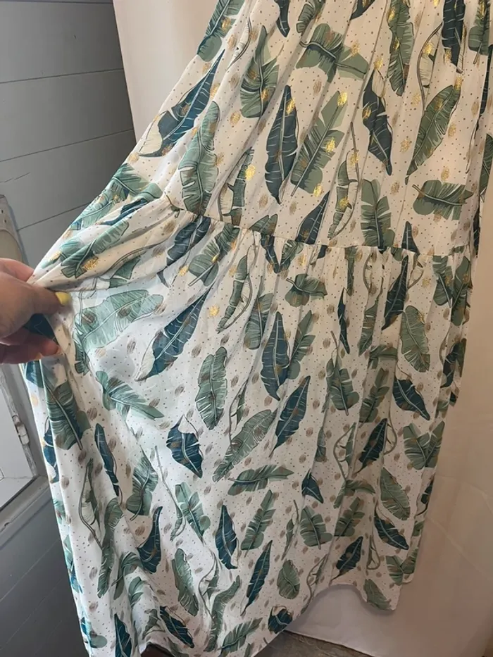 Robe longue Fluide Blanche imprimée feuilles verte et doré Taille 38/40 Ceinture Aisselle à aisselle 42 cm Longueur 145 cm