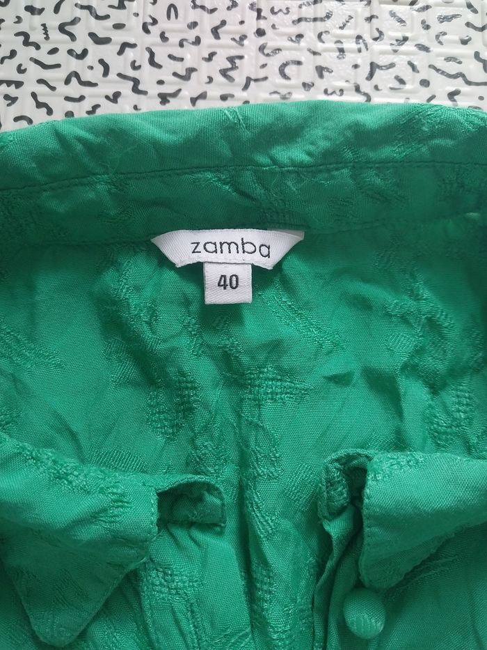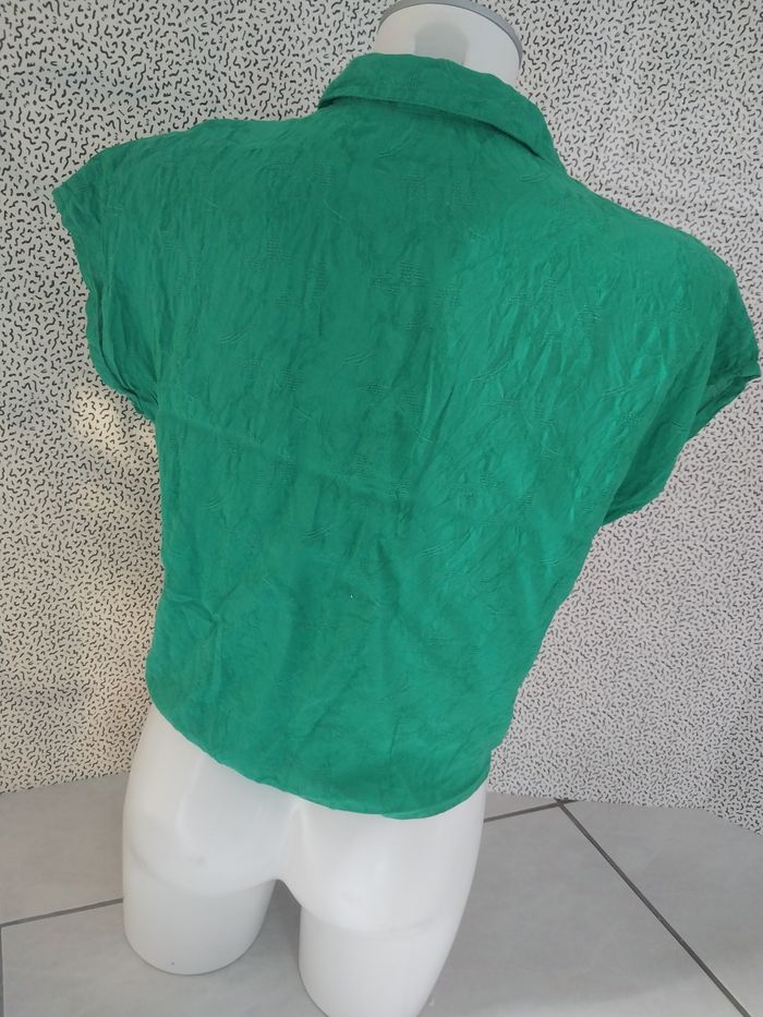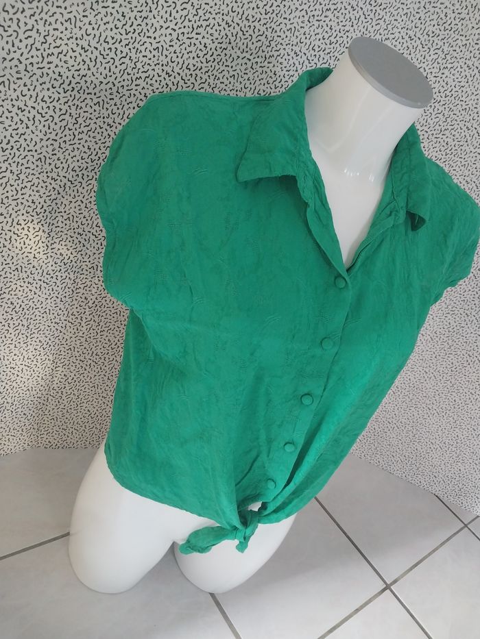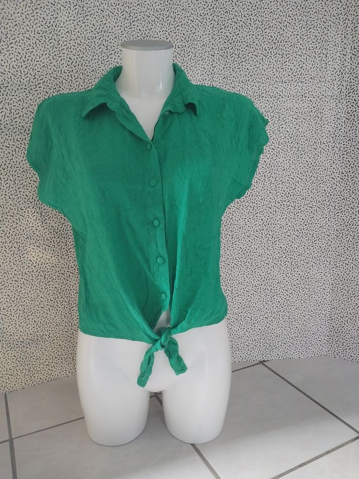 Joli chemisier vert vif à nouer sur le devant, de la marque Zamba. Tissu léger avec un effet froissé et de discrets motifs en relief, très agréable à porter. Fermeture par boutons recouverts ton sur ton. Coupe fluide, manches courtes et col chemise. 🟢 Taille : 40 🟢 Couleur : Vert émeraude 🟢 État : Bon état, peu porté ✨ Idéal pour un look estival, décontracté ou chic selon l’association. #chemise #chemisier #zamba #vert #noué