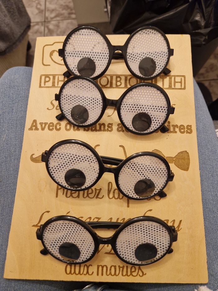 Lot composé d'une pancarte en bois gravé Plusieurs accessoires et paires de lunettes