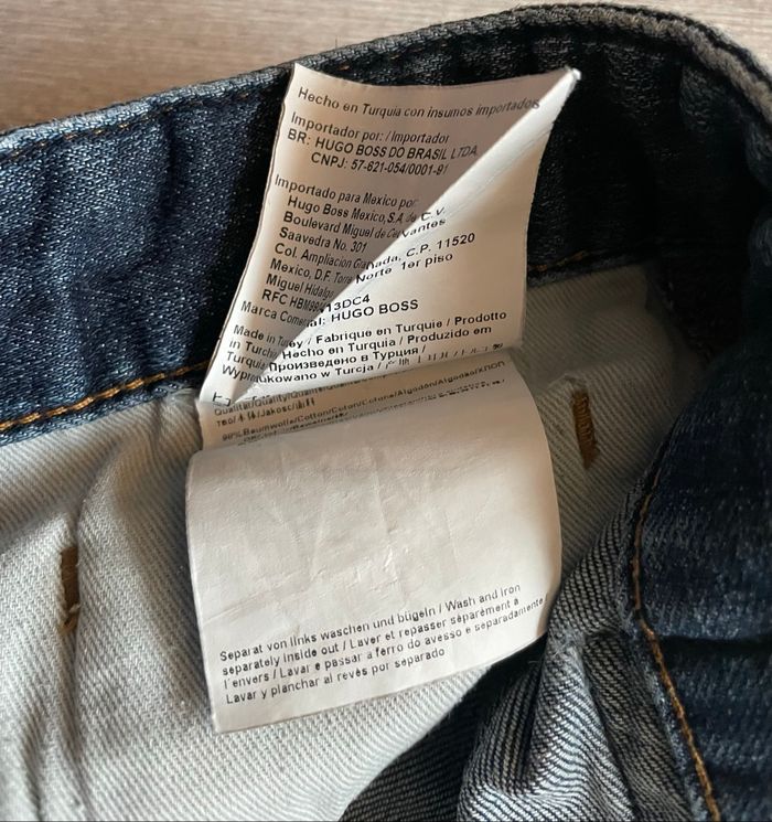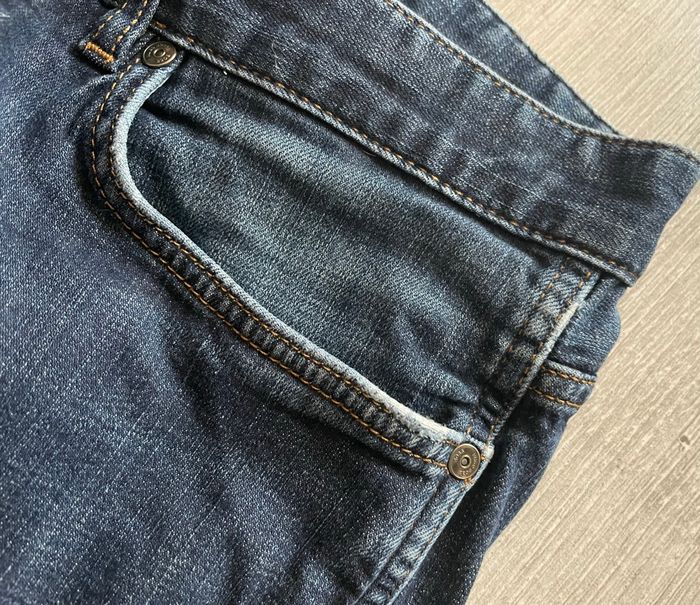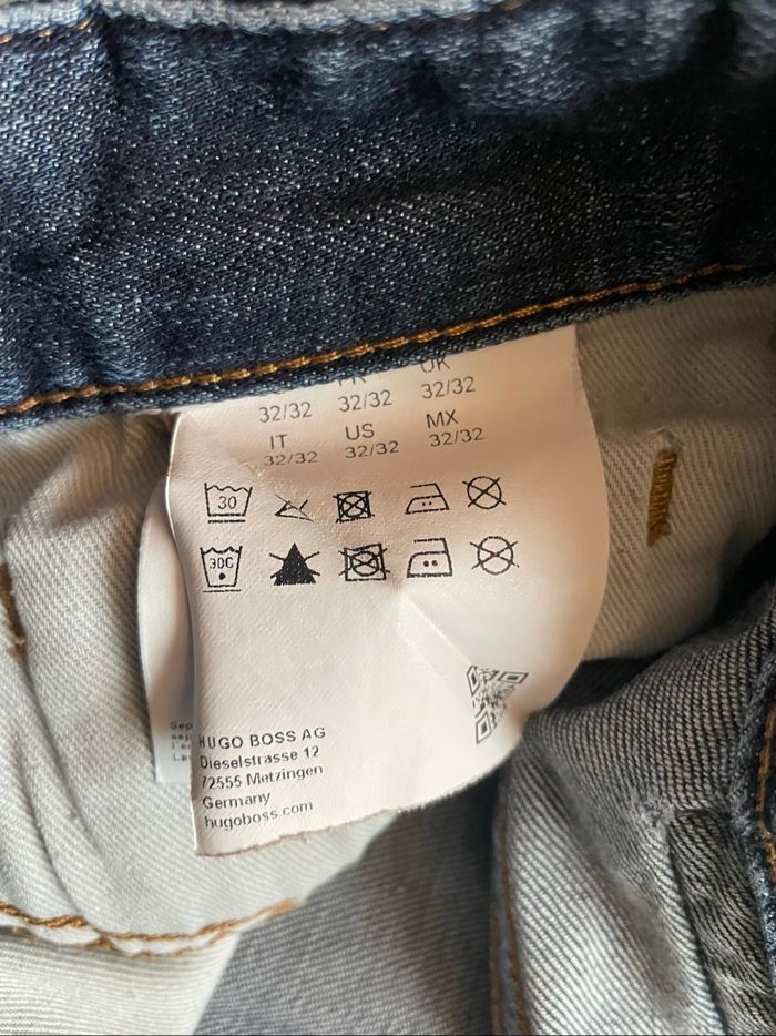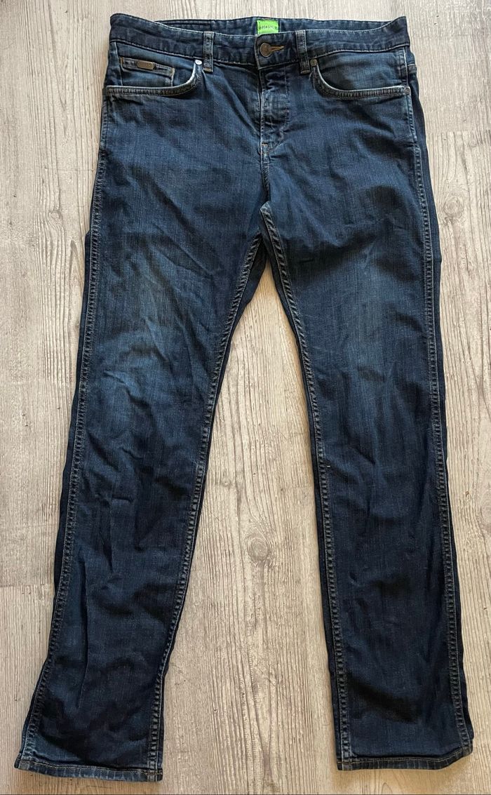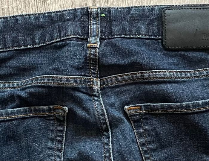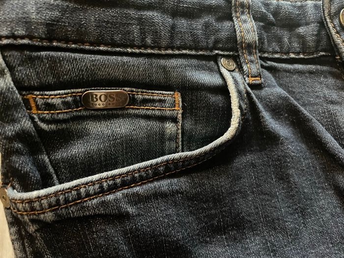 Jean de la marque Hugo Boss Taille 32/32 Dimensions largeur à la ceinture 41cm, longueur 98cm Traces de frottement à l’arrière et aux poches (voir photos) Occasion, bon état