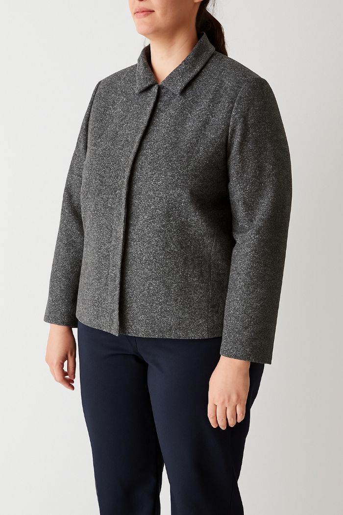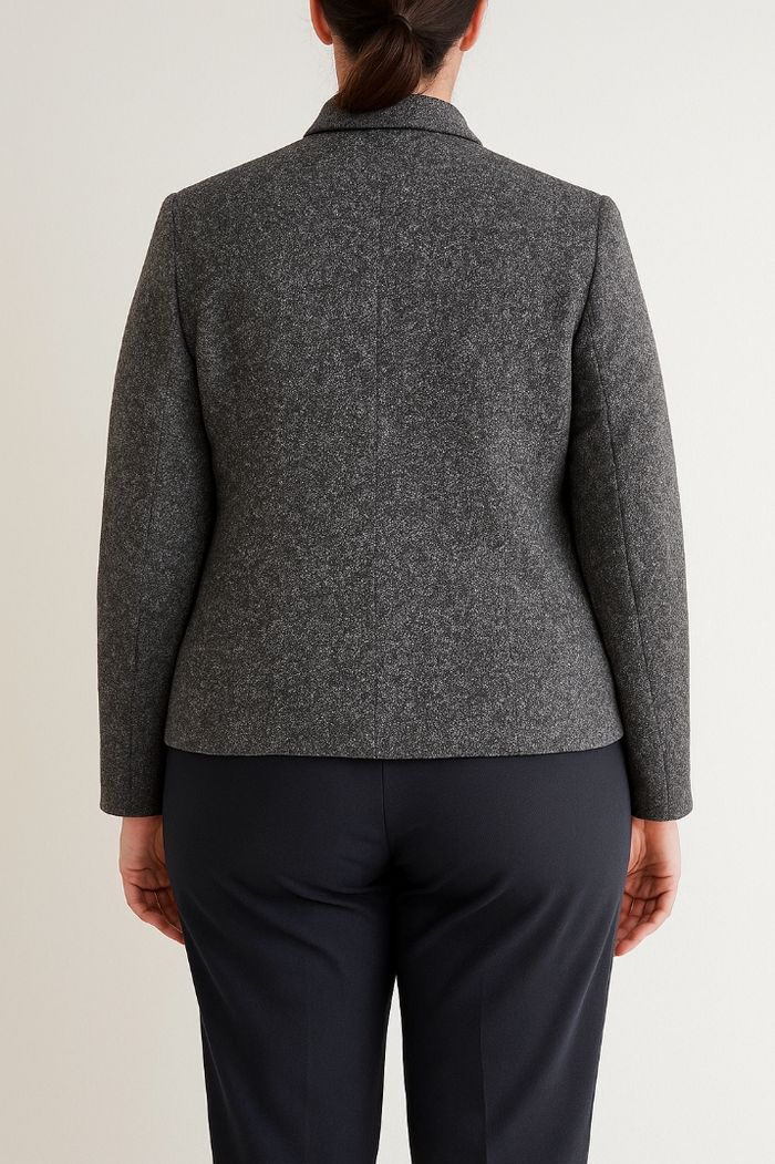 ✔️ Coupe : Courte et structurée, type blazer décontracté. Col montant/revers. Fermeture éclair discrète sur le devant.