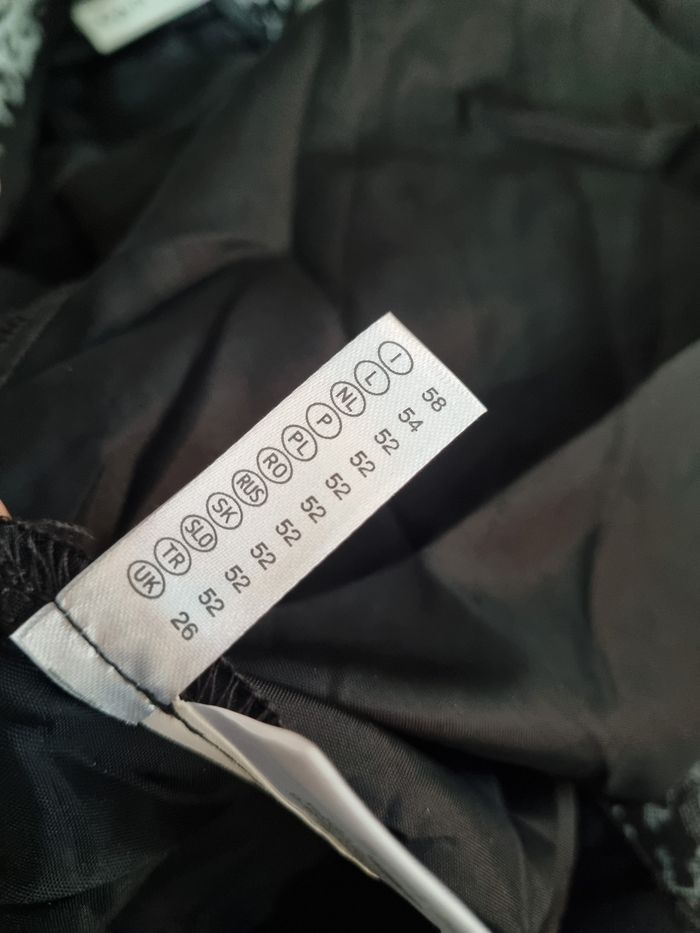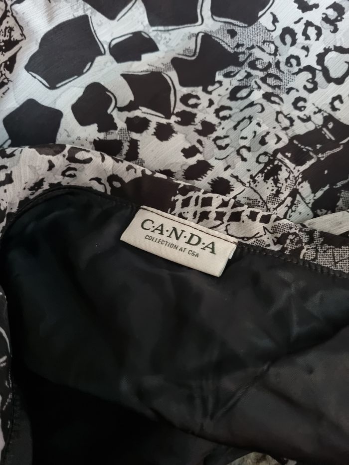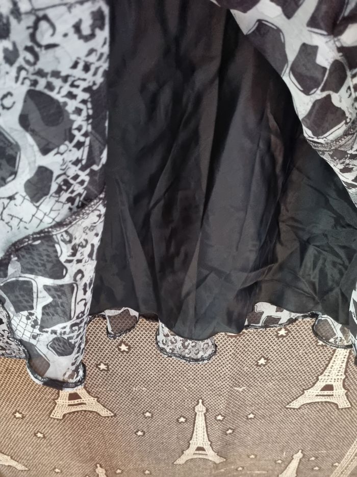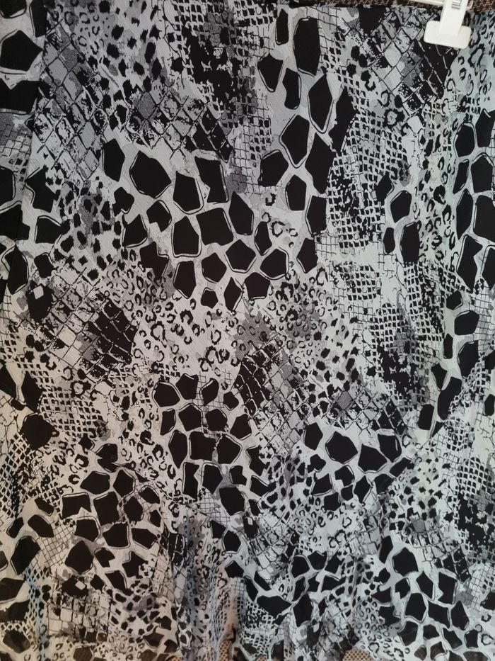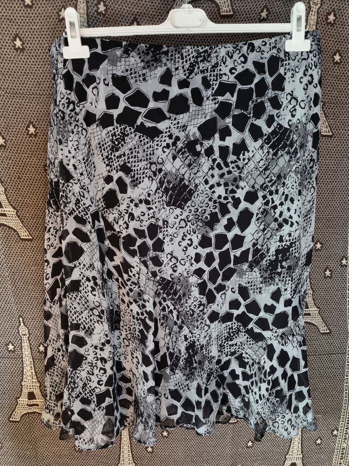 Jupe grise à motifs noir ,taille 54 marque Canda, jupon intégré, longueur 72cm, largeur de la taille 56cm ,largeur 72cm.