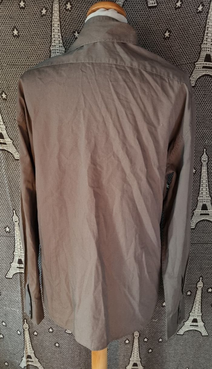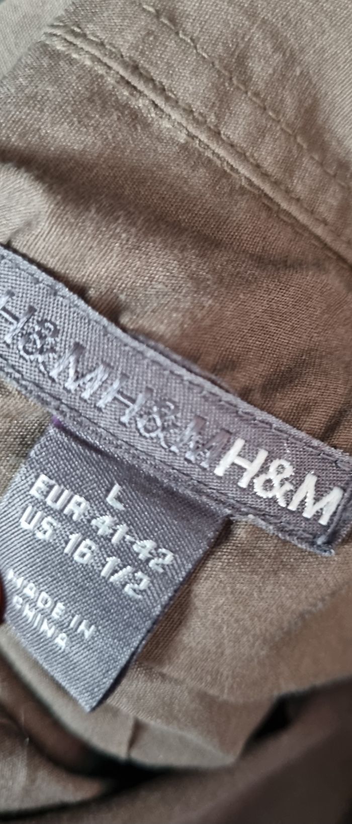 Chemise uni couleur taupe à manches longues, taille L marque H&M, longueur 64cm, largeur 47cm ,longueur épaule à aisselle 22cm, largeur aisselle à aisselle 51cm, longueur manche 52cm.