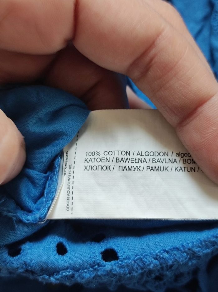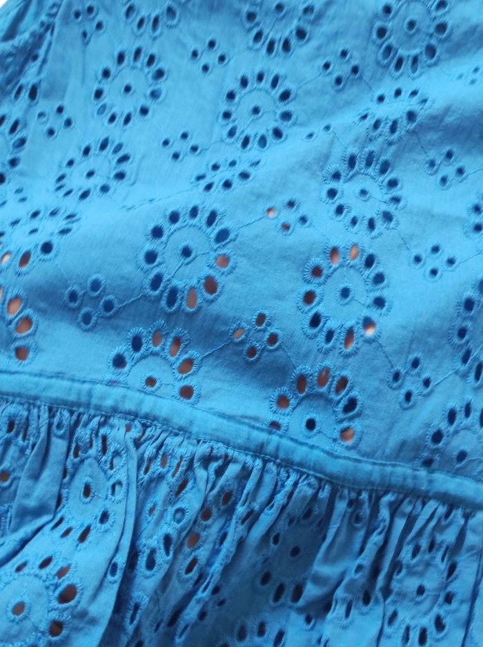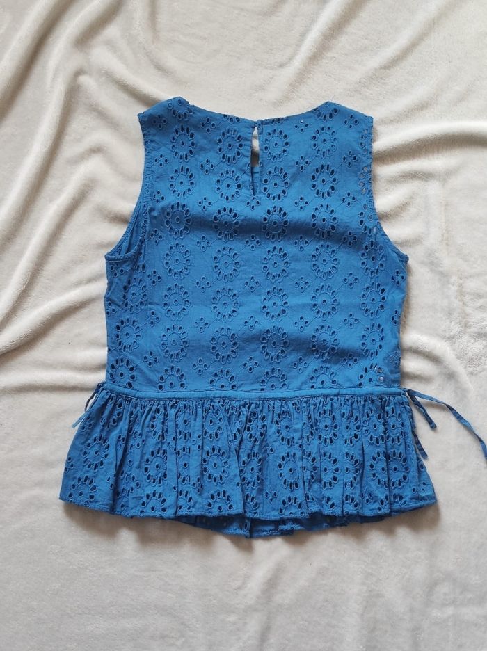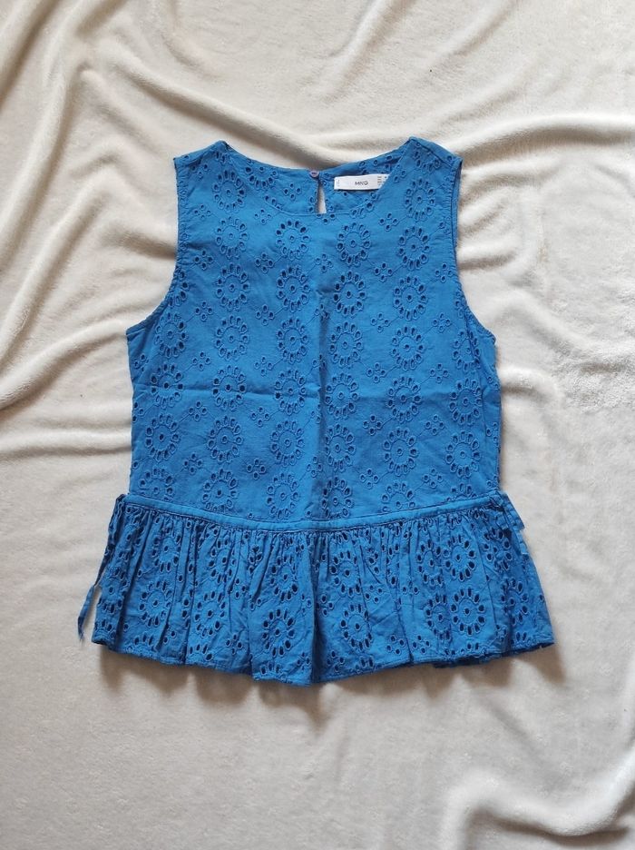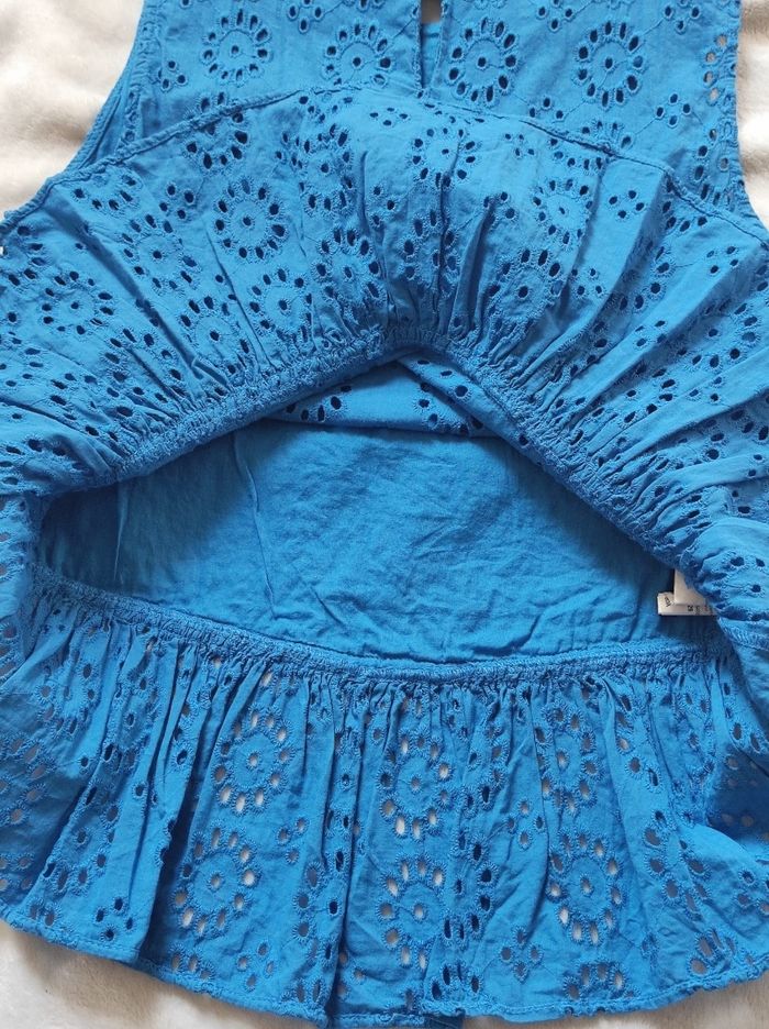jolie petite haut bleu brodé ( intérieur doublé à l'avant ), sans manches, bas volant. 100% coton. Marque mango en taille XS. Bon état général. Ni trous tâches ou déchirures mais le bleu est un peu moins vif qu'au début.