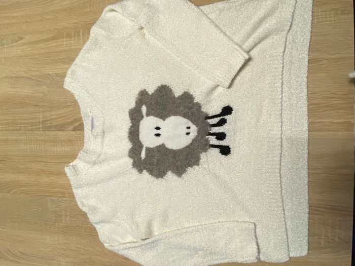 Pull over bouclette écru, motif mouton. Le pull over mesure 57 cm de large. L'étiquette a été coupée pour une question de confort, pull, hiver, écru, bouclettes, femme, haut