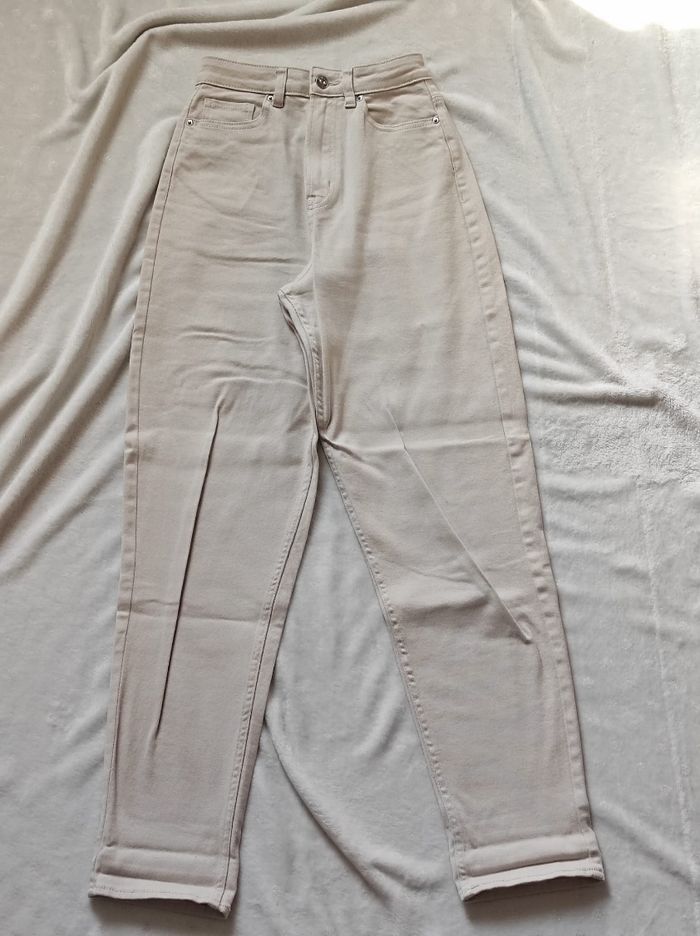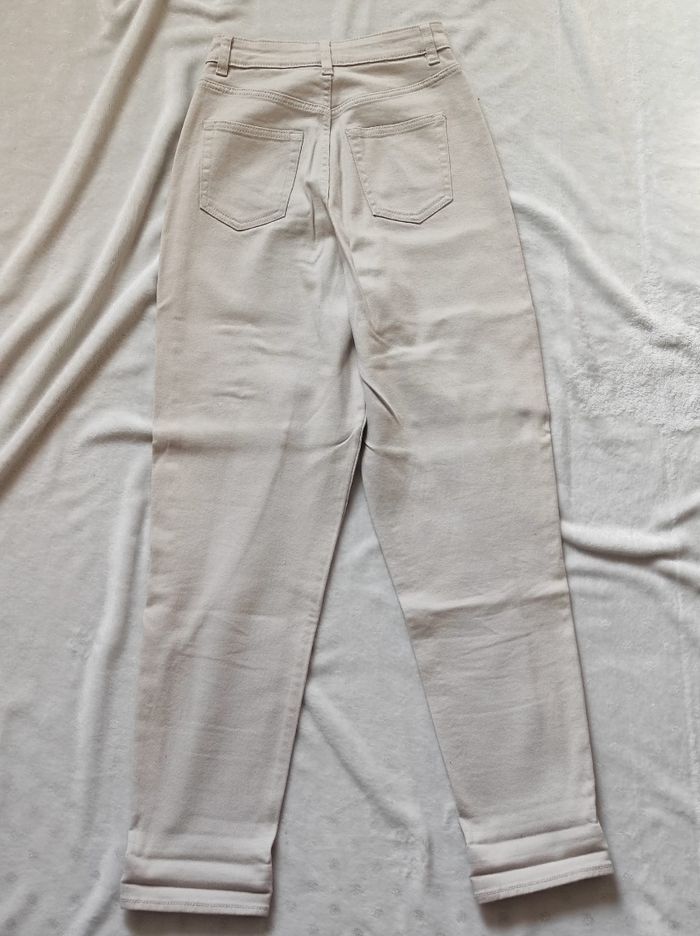 jean taille haute et coupe droite ( le bas était plié en ourlet ). De couleur blanc écru/ beige clair. Matière 98% coton et 2% elasthanne. Marque h&m collection divided en taille 32 / XXS. En parfait état, peu porté. Ni trous tâches ou déchirures.