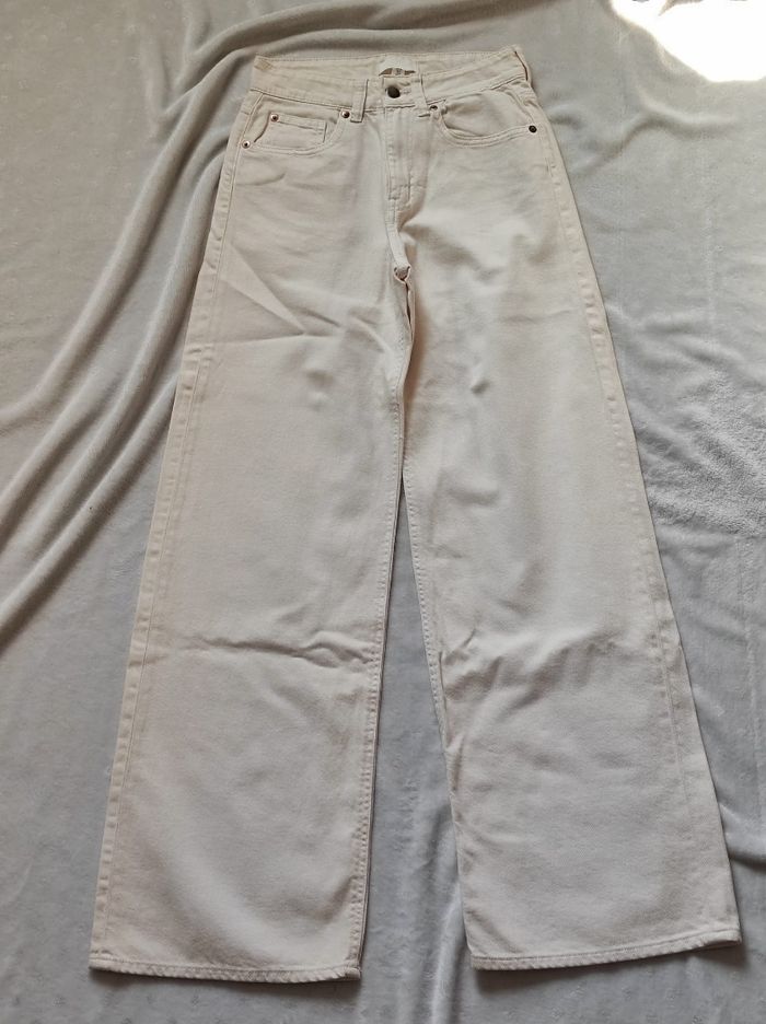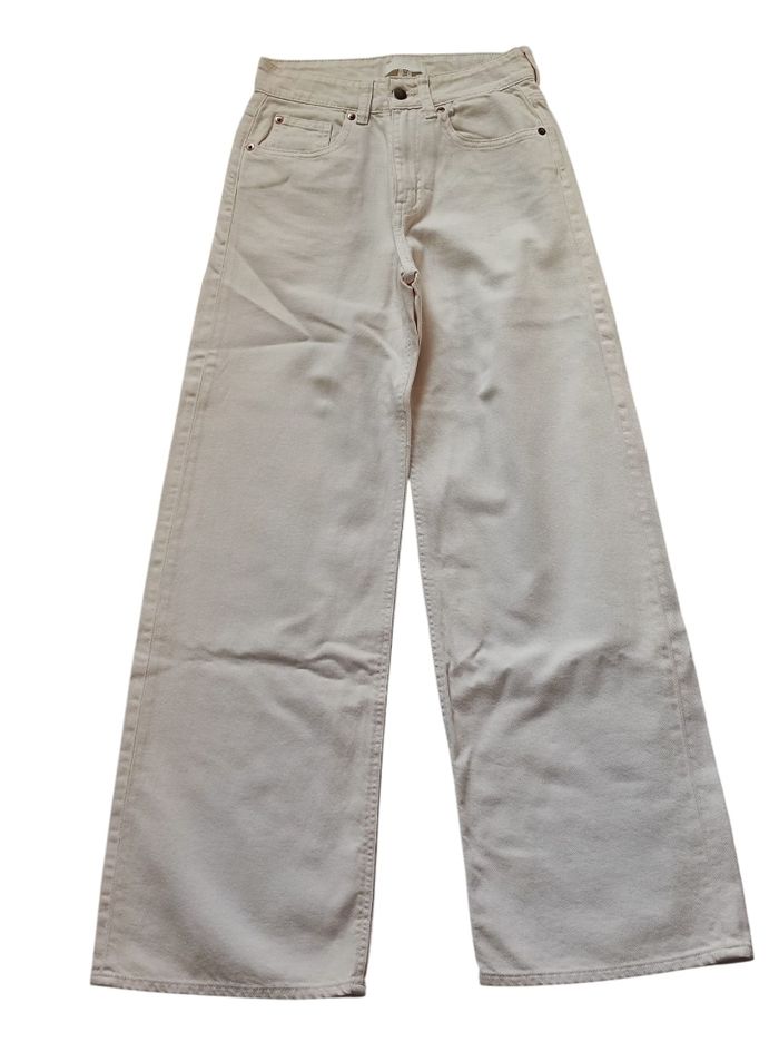 superbe jean à jambes large dite " patte def " en couleur blanc écru. Fermeture éclair et bouton. Plusieurs poches. 100% coton Marque h&m en taille 34 / XS. Ni trous tâches ou déchirures, en parfait état.