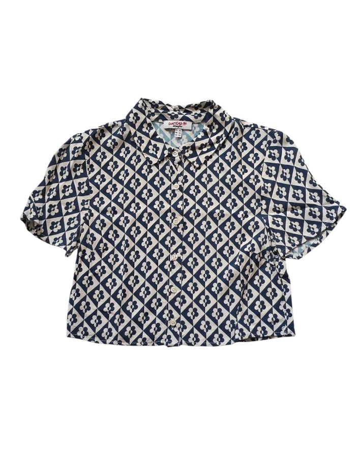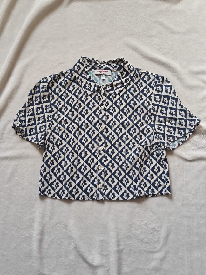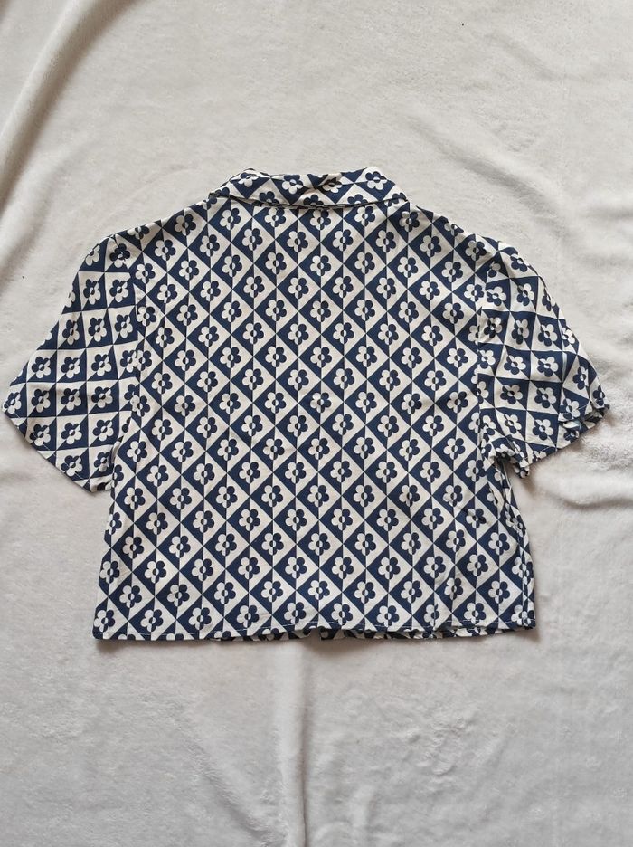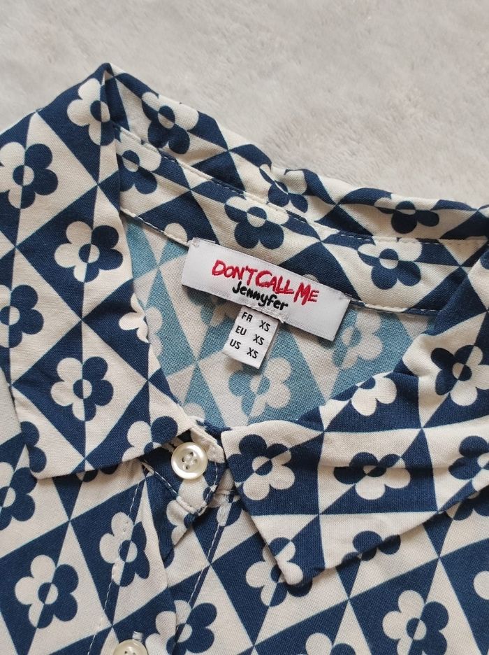 petit top chemisier court oversize à motifs asymétriques. Couleur mélangée bleu marine / écru. 100% viscose. Marque Jennyfer en taille XS. En parfait état.
