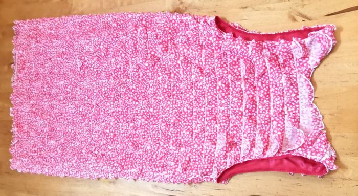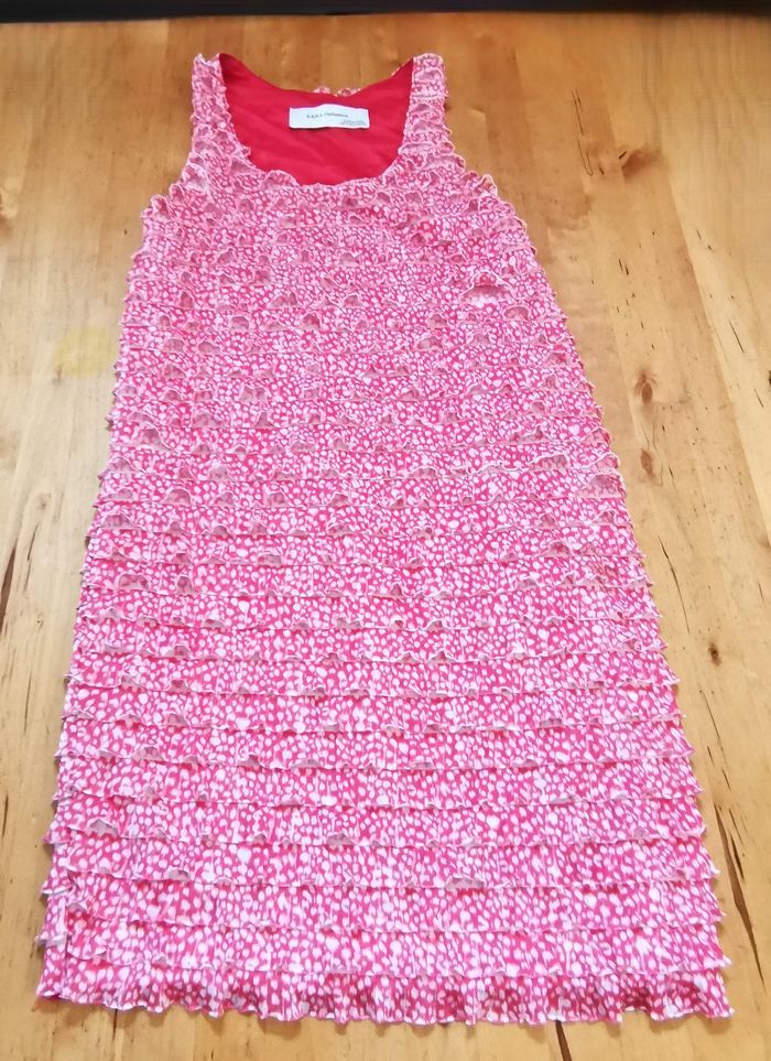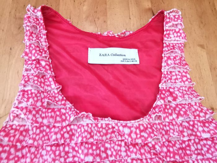 Robe "Zara Collection", en tissu fluide à petits volants, couleur rose à pois blancs, modèle sans manches, longueur au genou, taille S, tbé.