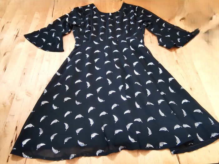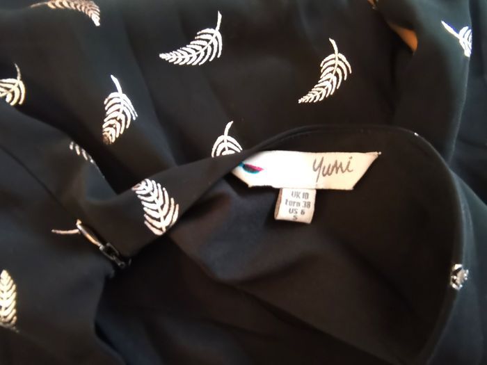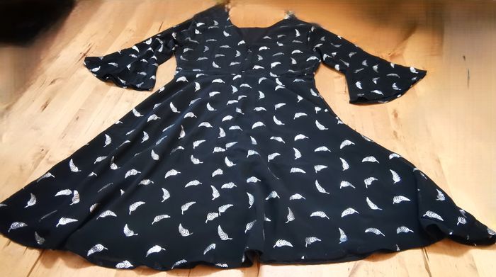 Robe "Yumi", en tissu fluide couleur noir à motifs dorés, manches 3/4, à finition à volants, bas évase, taille 38, longueur au genou, quasi neuve, tbé.