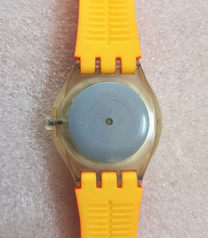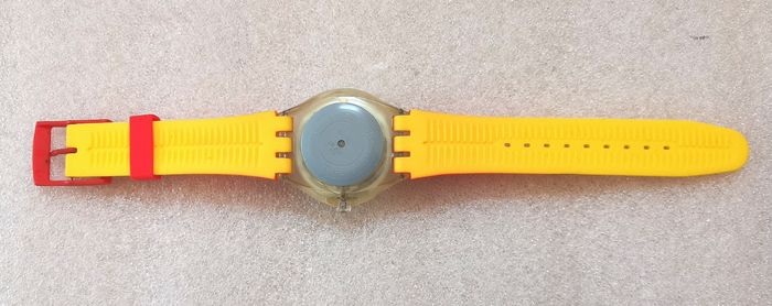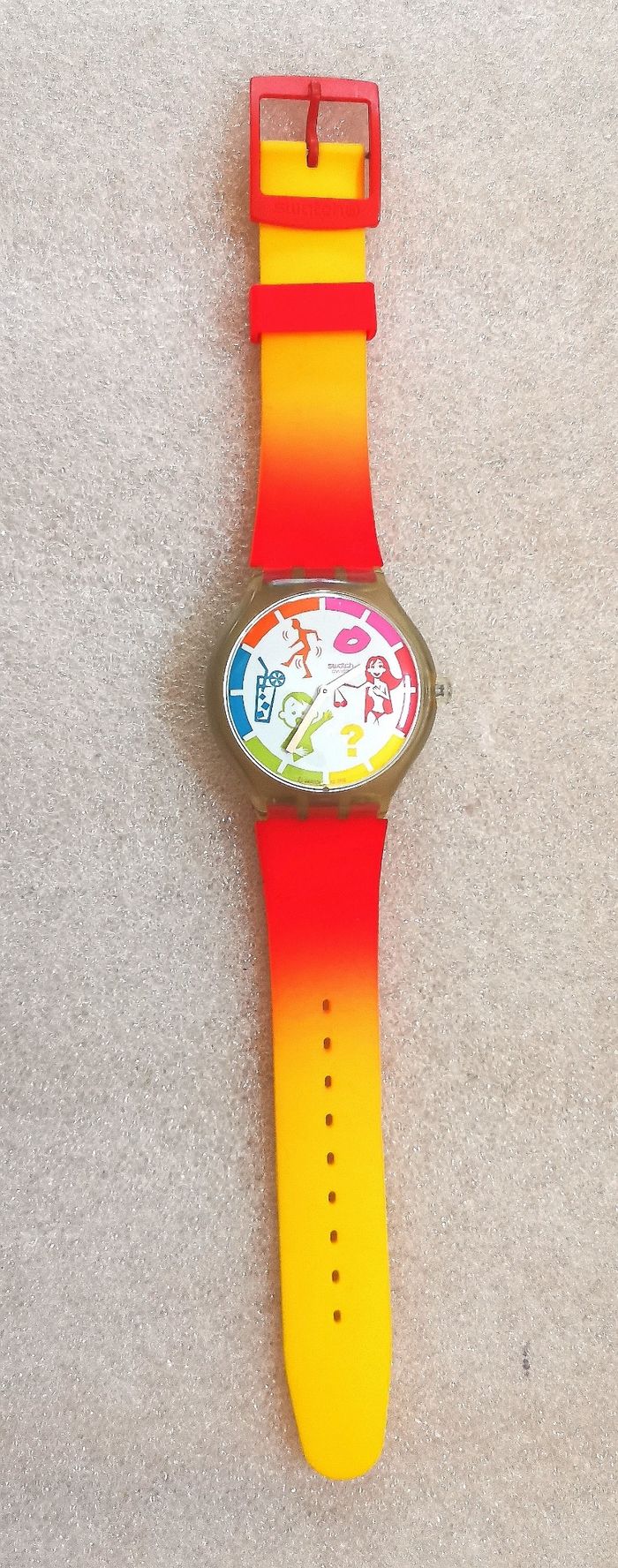 Montre SWATCH Collecteur "Fateful Game", STGK 108, Collection Touch Game 2006, boîtier transparent de 40,8 mm, à intérieur à motifs colorés, aiguilles argent, et bracelet jaune rouge, qui n'est pas d'origine, fonctionnante, pile fourni, prix définitif.
