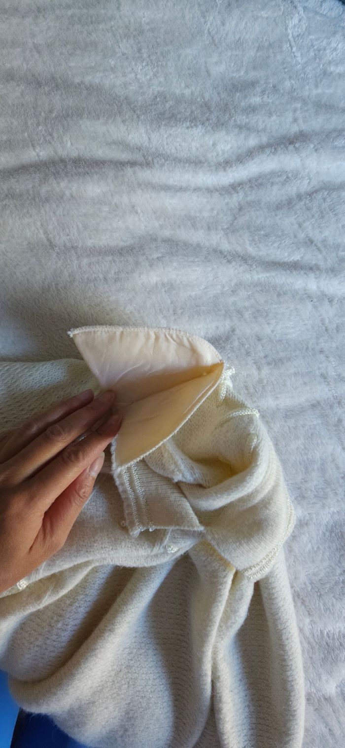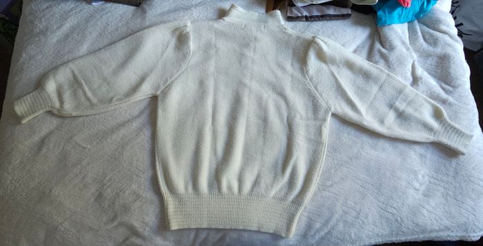 Pull femme de couleur creme/blanc cassé, avec épaulettes motif devant et perle Taille S