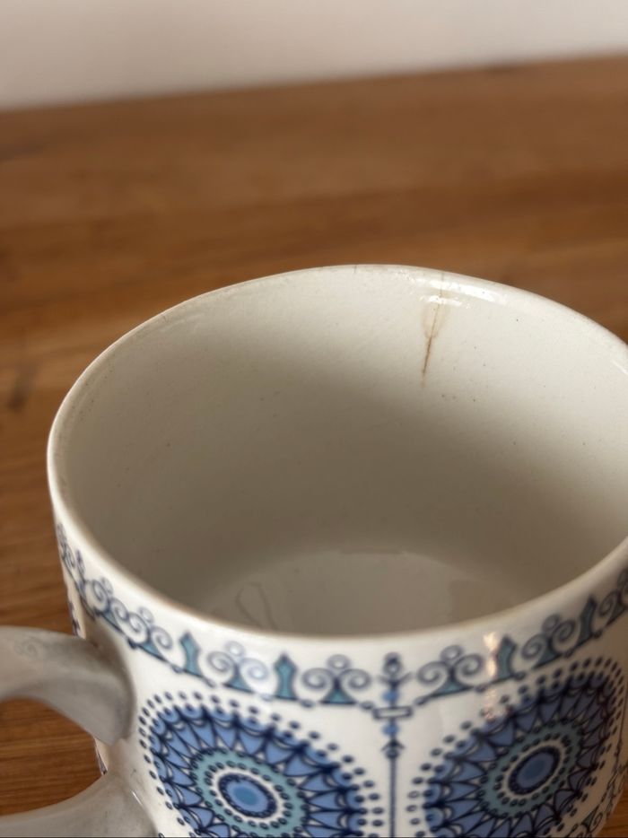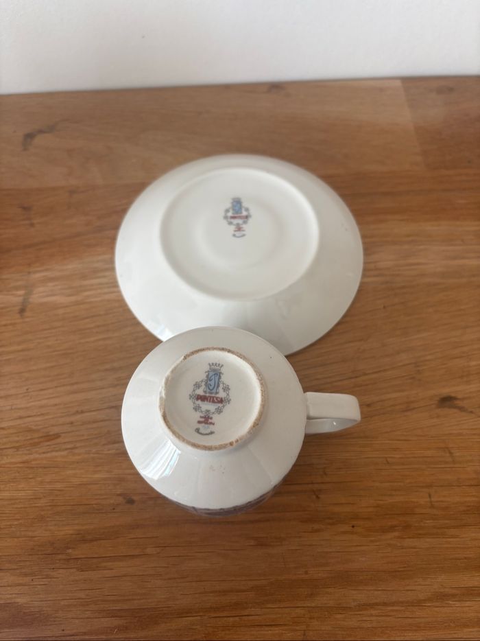 Bel ensemble de 4 tasses et leurs soucoupes Marque espagnole Pontesa En porcelaine Diamètre soucoupe 11,8 cm Hauteur tasse 6 cm Diamètre tasse 6 cm Mises en état satisfaisant en raison de défauts liés au temps visible sur les photo (les photos sont zoomées : en réalité peu visibles), ce sont des objets d’occasion merci de ne pas l’oublier, le tout reste totalement utilisable