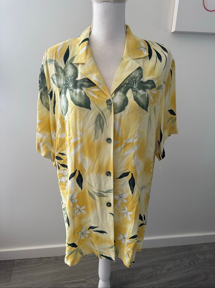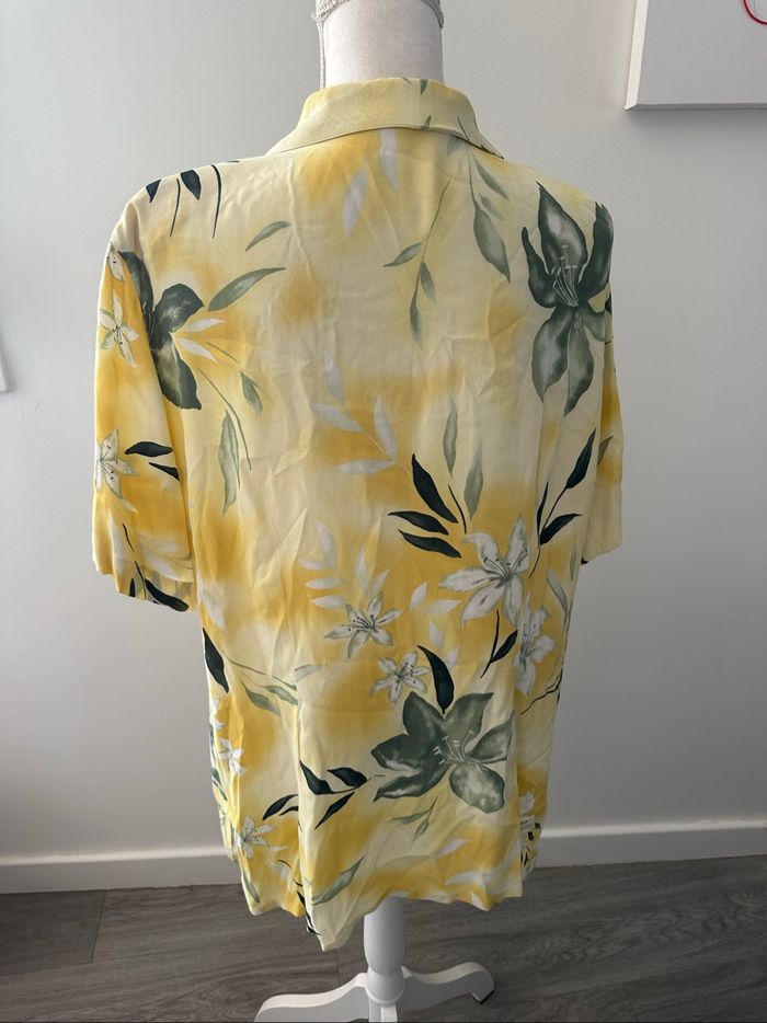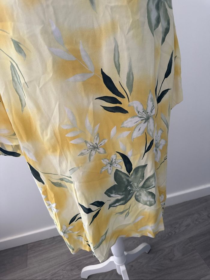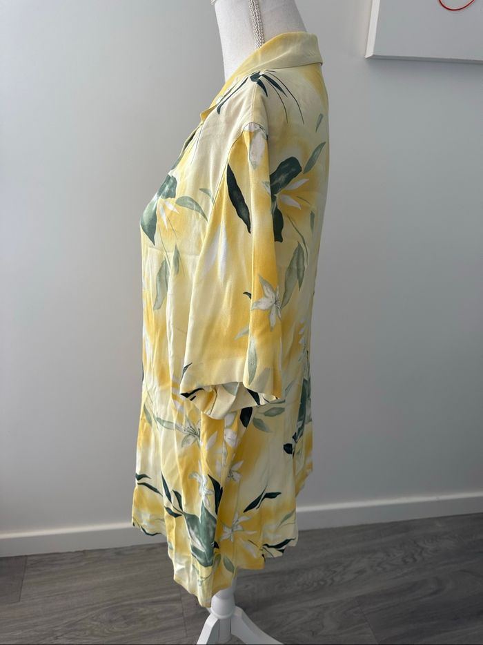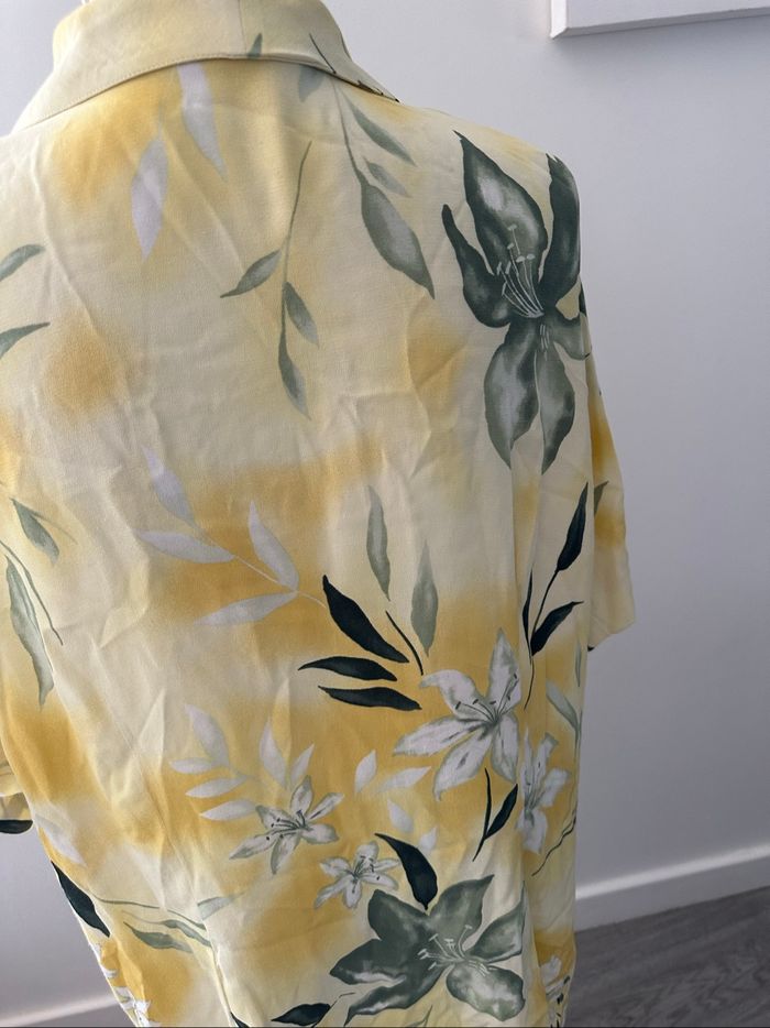 Chemisier - Excellent état - Taille 50 équivalent 5XL Dimensions en bas de l’annonce - Jaune et kaki - Imprimés fleurs - Canda Vintage - Manches courtes - Se ferme avec des boutons - Pas d’étiquette de taille ni de matière Dimensions: - 49cm niveau épaules - 64cm niveau aisselles - 73cm de long