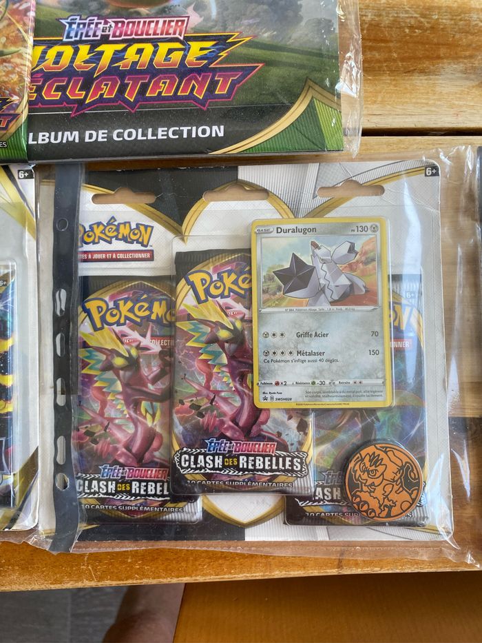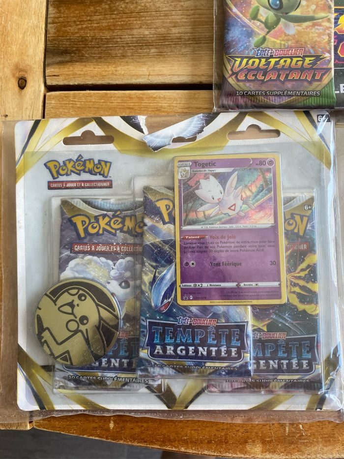 Lot 3 items Pokémon parfaitement scellés 1 pack collection voltage éclatant 1 tripack tempête argentée ( petit bout carton déchiré voir photo ) 1 tripack clash des rebelles