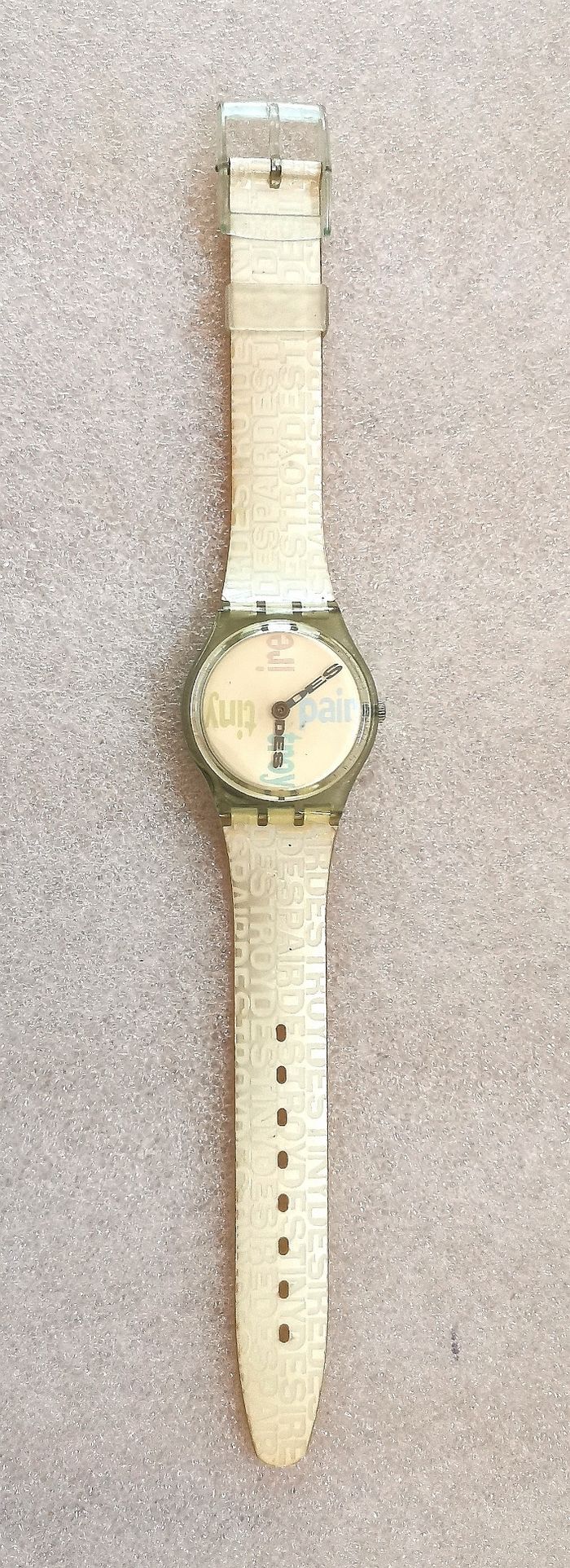 Montre SWATCH Collecteur Vintage "Destime", GG 144, Collection Gents, boîtier de 34 mm à intérieur blanc à écritures colorés, aiguilles écritures (Des), et bracelet en résine à écritures blanches, fonctionnante, pile fourni, prix définitif.