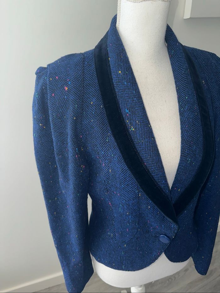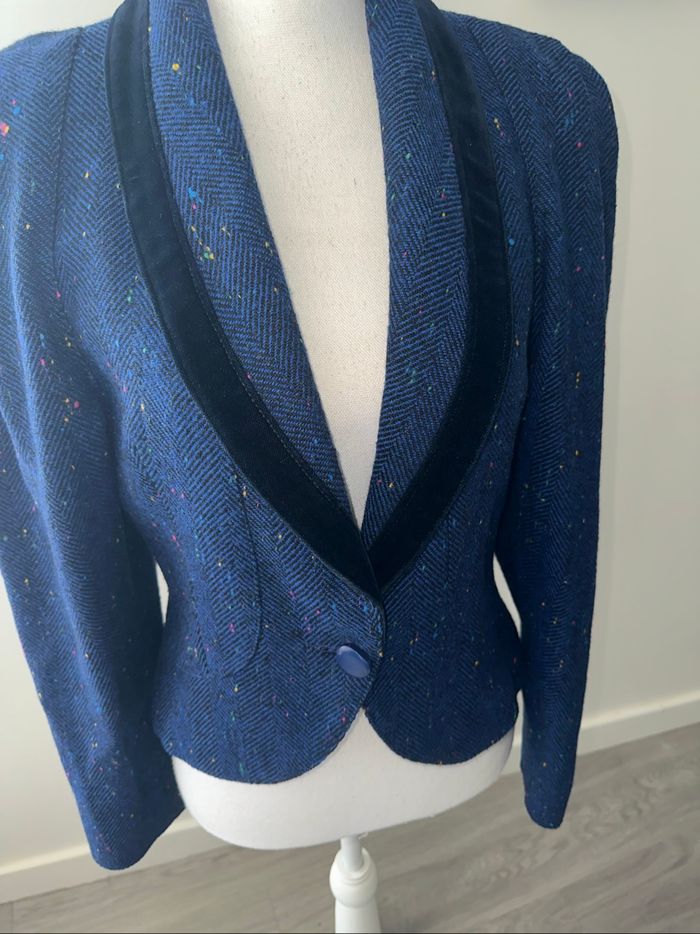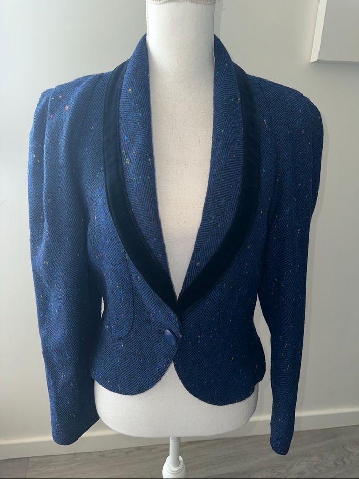 Blazer - Excellent état - Taille 36 équivalent S Dimensions en bas de l’annonce - Bleu marine et multicolore - Tissus tweed laine moucheté - Doublure intérieure - Vintage, années 80’ - Tissus velours au niveau du col Dimensions: - 45cm niveau aisselles - 54cm de long
