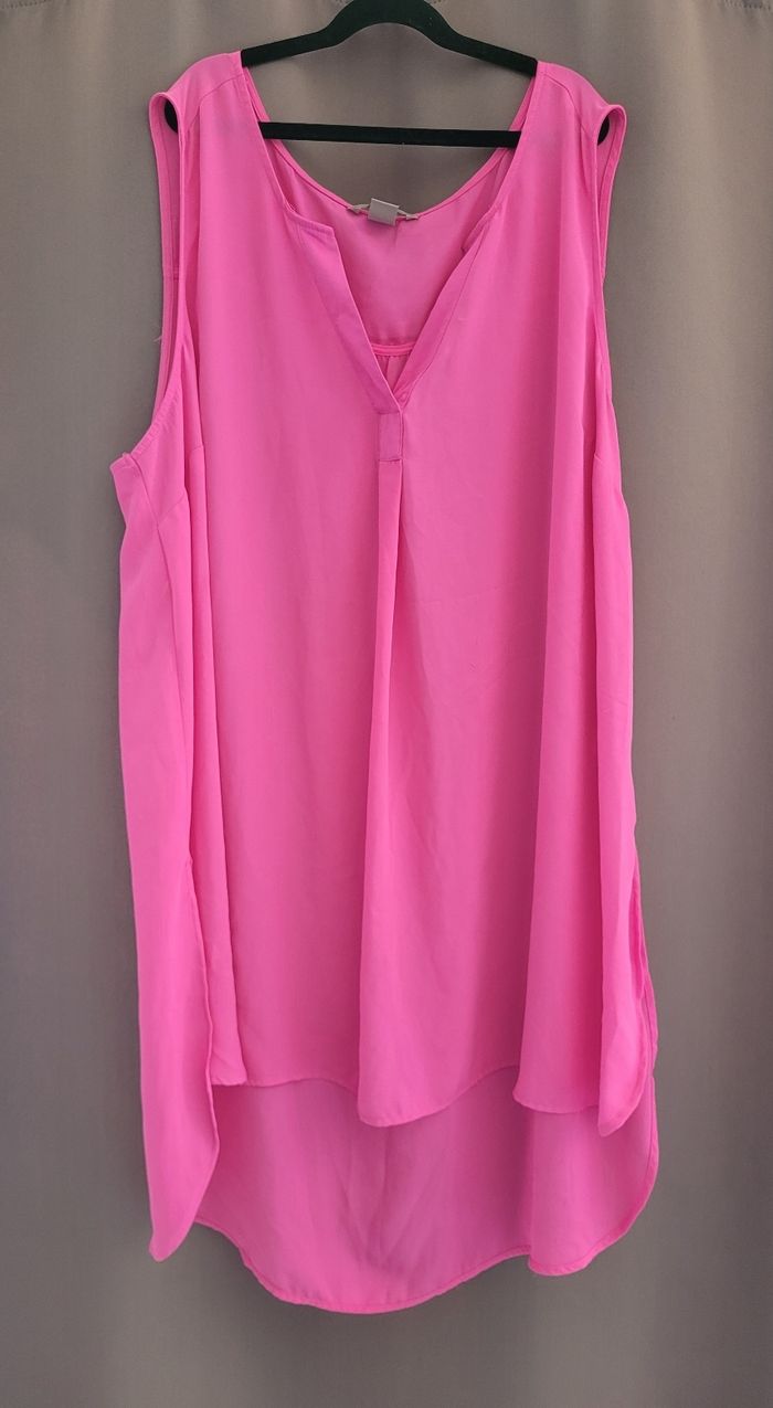 Blouse fluide, de couleur fuschia légèrement transparente, de la marque H&M, taille 52, en très bon état. Article lavé pour la vente.