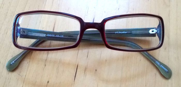 Lunettes de Vue "A. Mahéo", en acétate couleur rouge et kaki, modèle classique, légères, verres à remplacer à votre vue, tbé.