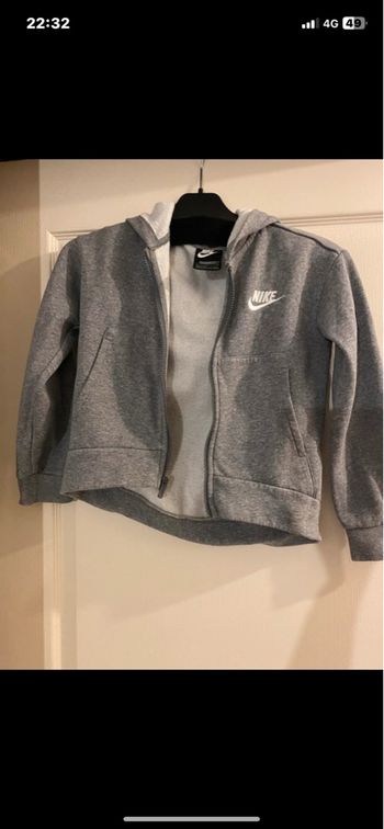 Gris foncé, épais, taille 1 an, double fermeture éclair + rabat à pressions, capuche doublée (qui peut s'enlever par zip) avec bord en fausse fourrure (qui s'enlève par pressions), 2 poches.