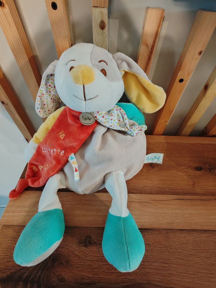Doudou pantin d'activités chien gris jaune rouge bleu BABY NAT Tbe Rangé pyjamas 15 euros envoi en relais