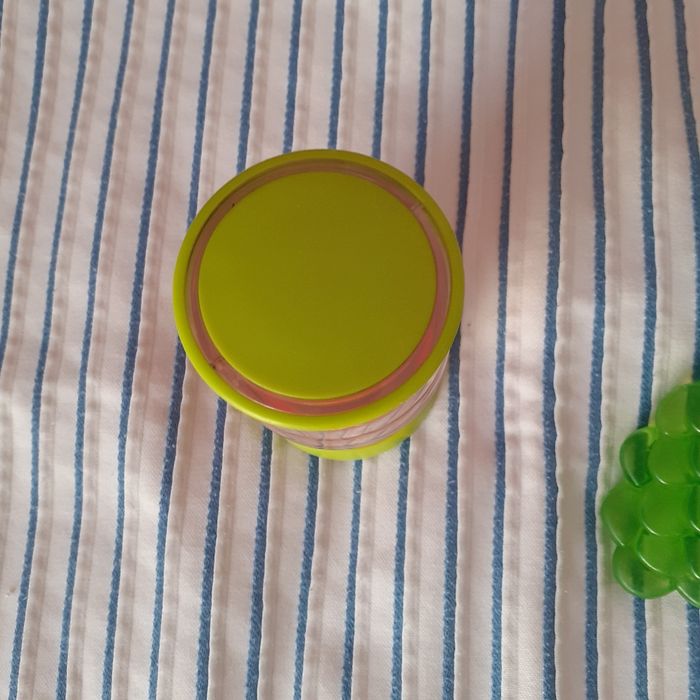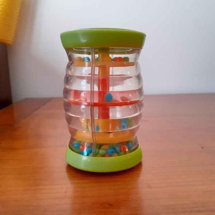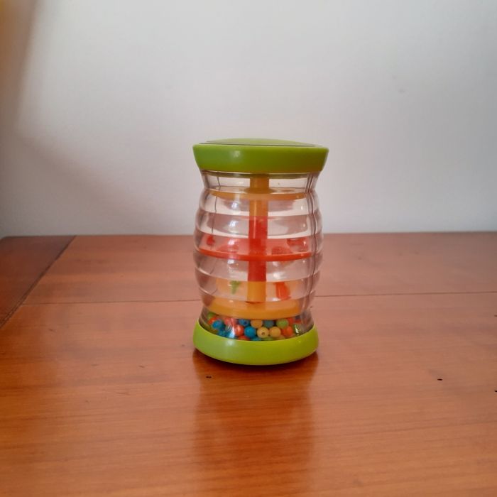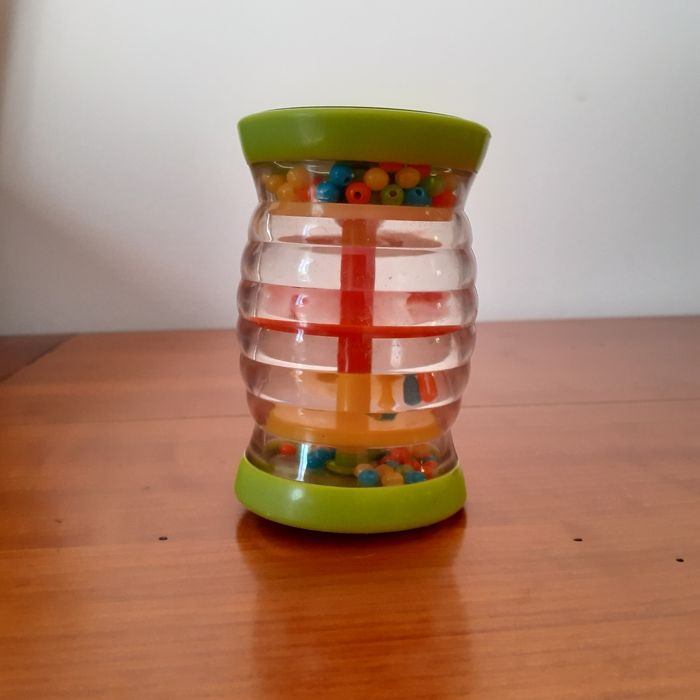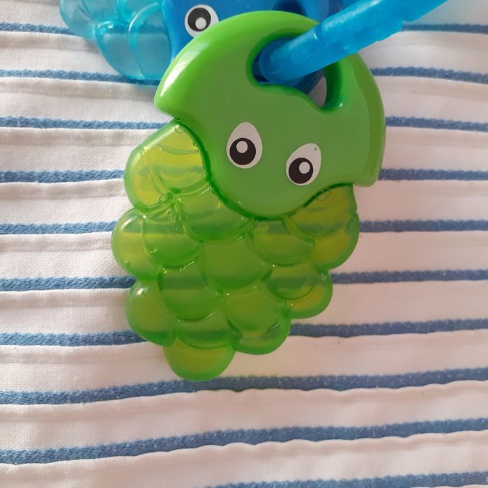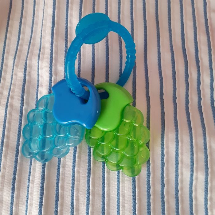 Le lot comprend : 1 petit bâton de pluie culbuto; perles multicolores; plastique loupe ( effet grossissant) Hauteur totale de 8,5 cm + 2 anneaux de dentition en forme de grappes de raisins contenant un liquide. Les anneaux peuvent être mis au réfrigérateur et le liquide refroidi Permet de soulager les gencives // voir photos pour détails. À Noter : qq traces d'usure sur le plastique du bâton de pluie. Bien tenir compte de ce paramètre ( pas de retour)