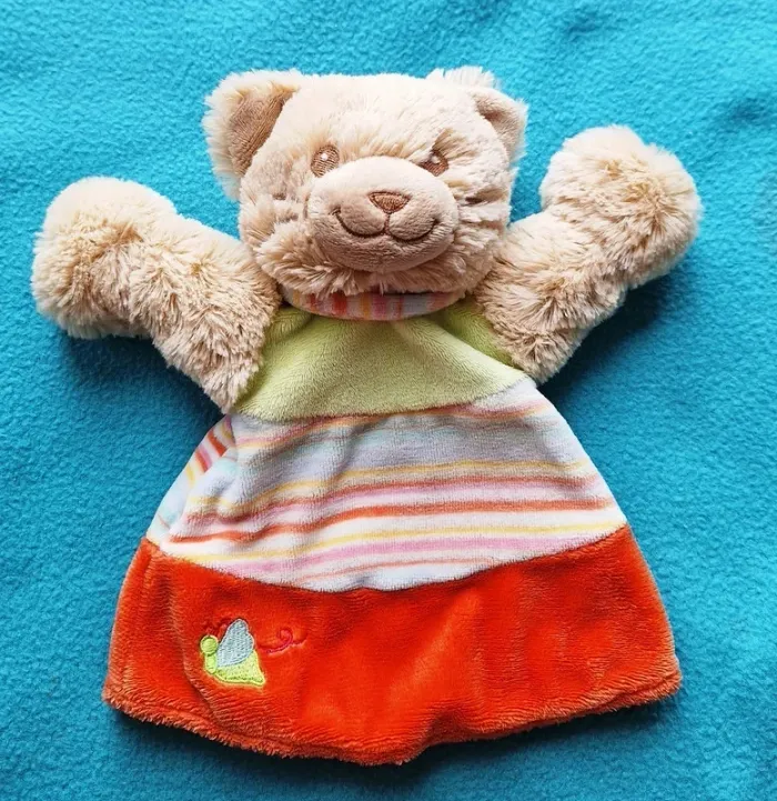 MARIONNETTE CHAT EN VELOURS MOUMOUTE BEIGE TENUE VERTE, ORANGE ET RAYEE ECHARPE RAYEE AUTOUR DU COU SUR LE BAS DE LA MARIONNETTE EST BRODE UN PAPILLON ETAT PARFAIT !