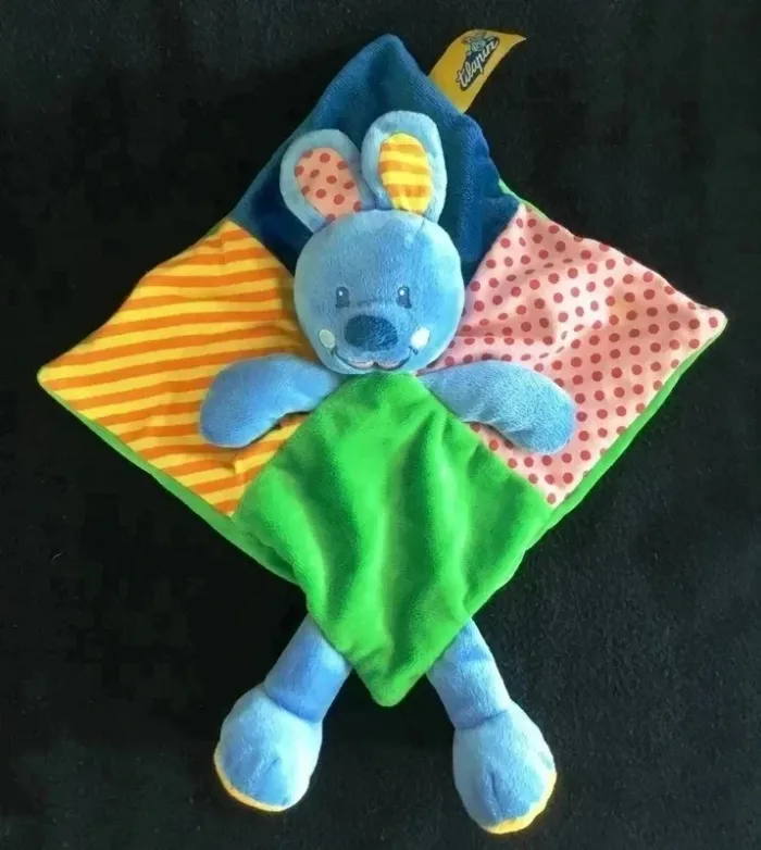 DOUDOU CARRE PLAT EN VELOURS ET TISSU DIFFERENTS MOTIFS SUR LE DESSUS ET EN VELOURS VERT SUR LE DESSOUS AU CENTRE DU DOUDOU, TETE PELUCHE TILAPIN BLEU SUR LE DEVANT, SORTENT SES 2 PATTES ETAT PARFAIT !