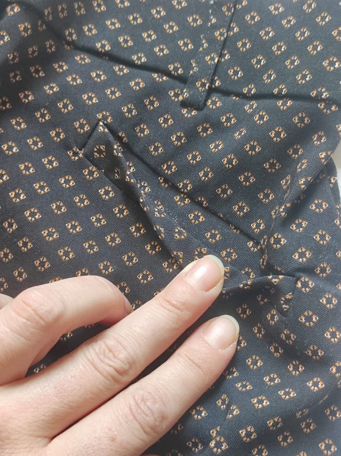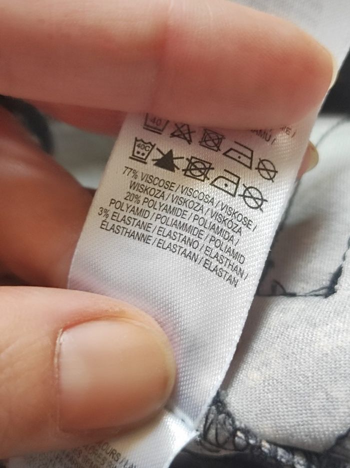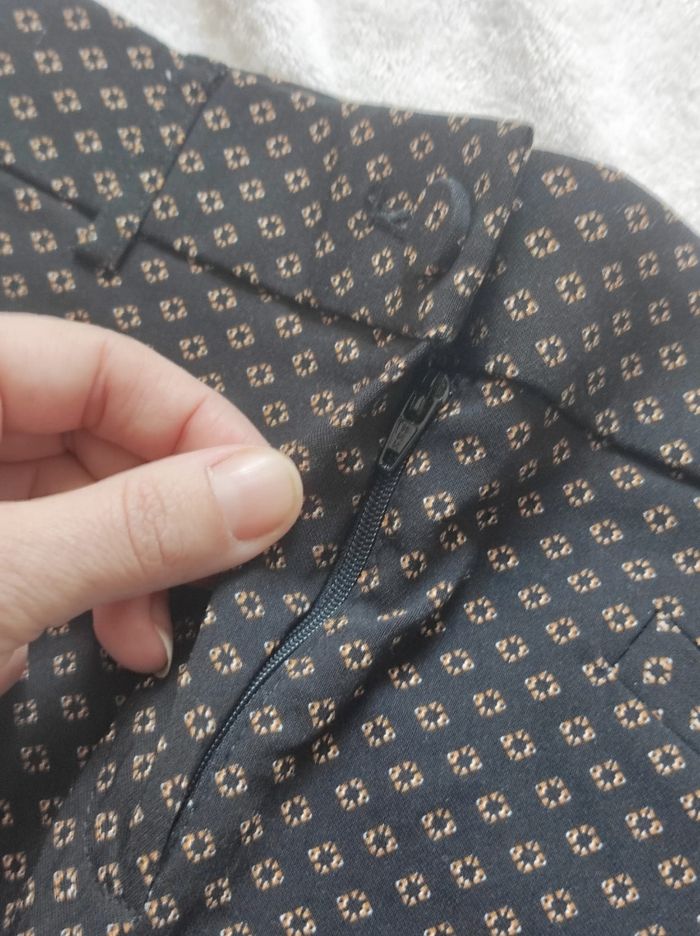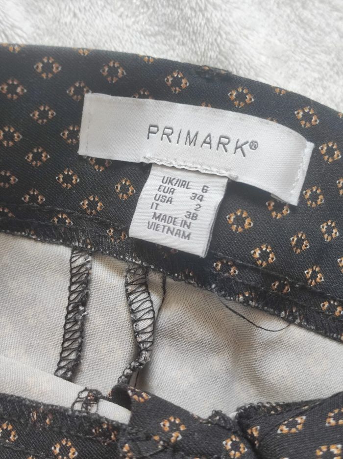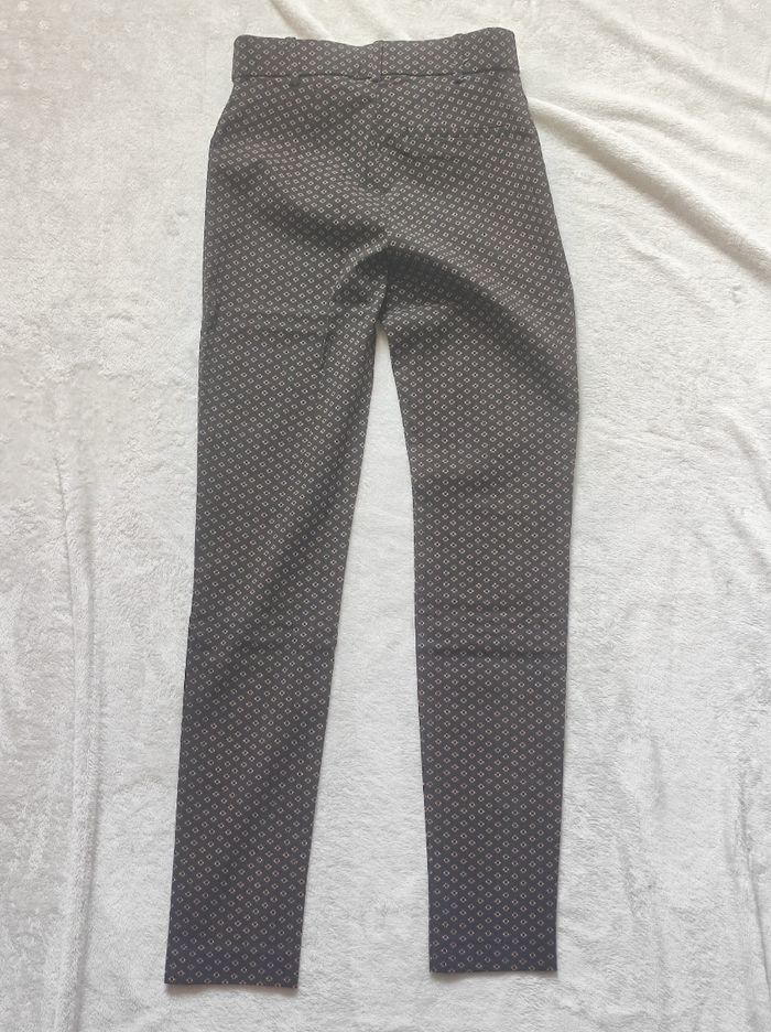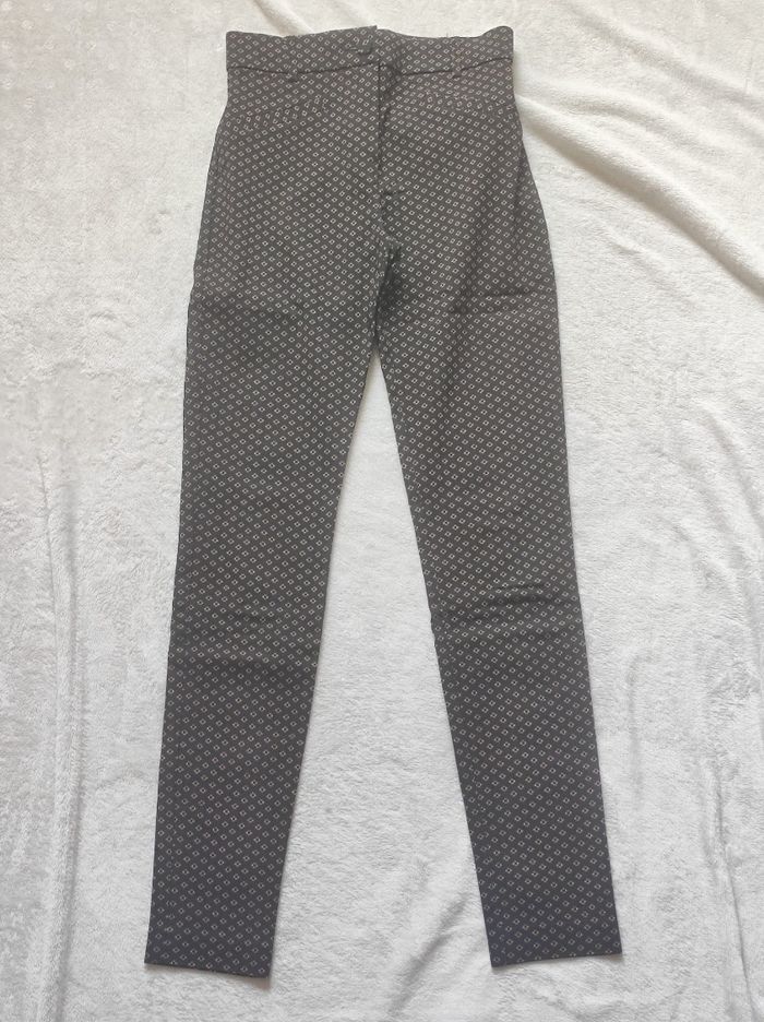 pantalon skinny à motifs en taille haute avec de fausses poches. Fermeture éclair et bouton. 77% viscose, 20% polyamide et 3% elasthanne. Marque primark en taille 34 / XS. En parfait état.
