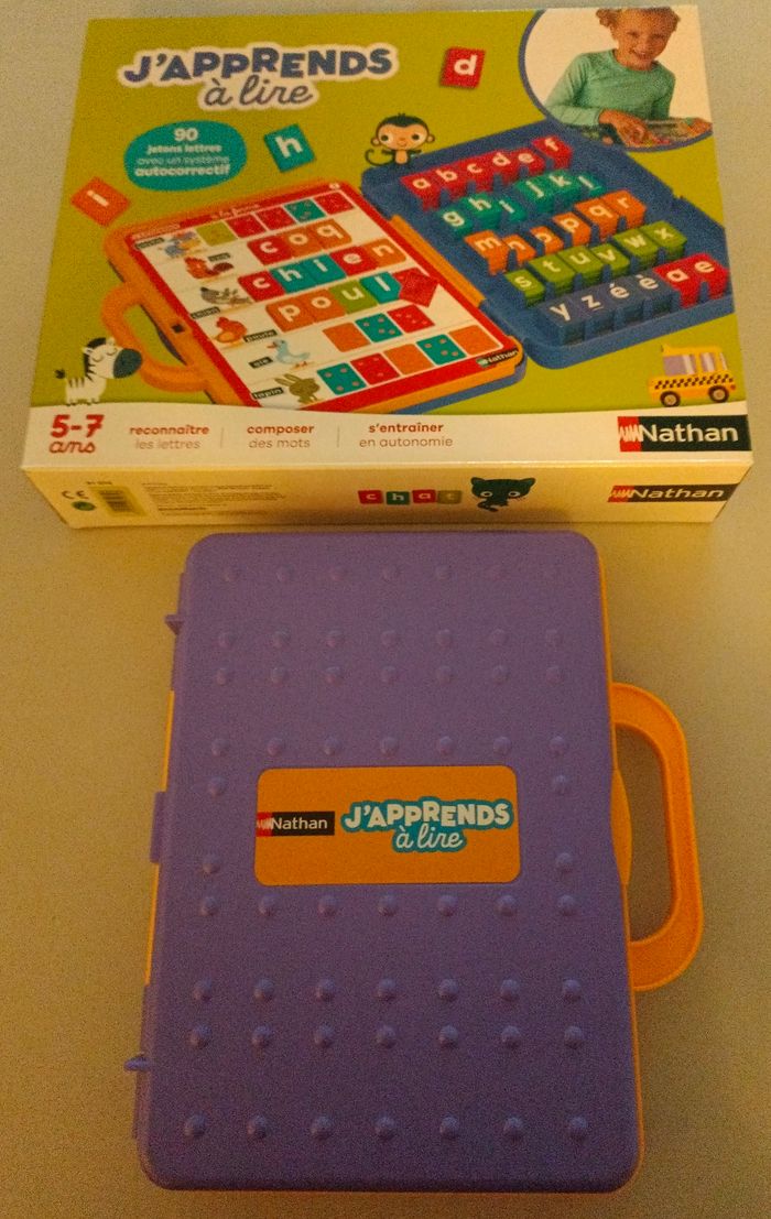 Découvrez le jeu éducatif J'apprends à lire de Nathan, conçu pour initier les enfants à la lecture tout en s’amusant. Un univers ludique et éducatif Plongez dans l'univers coloré de J'apprends à lire, où les enfants sont conviés à explorer les mots de manière interactive. Avec 90 jetons lettres, ce jeu permet de composer une multitude de mots tout en développant leur vocabulaire. Les planches illustrées et les personnages amusants créent une ambiance engageante qui stimule la curiosité des plus jeunes. Chaque session devient une aventure où apprendre à lire devient un véritable jeu d'enfant. Idéal pour les enfants de maternelle Destiné aux enfants de 5 à 7 ans, J'apprends à lire est un outil parfait pour la maternelle. Facile à transporter, il permet aux enfants de s’entraîner en toute autonomie, tout en renforçant leur capacité à reconnaître les lettres et à former des mots. Les 106 pièces à assembler garantissent une expérience d'apprentissage variée et dynamique, adaptée aux besoins de chaque enfant. Grâce à son système autocorrectif, les jeunes lecteurs peuvent s'exercer sans crainte d'erreur, développant ainsi leur confiance en eux. Offrez à votre enfant une passerelle vers le monde des mots avec J'apprends à lire, un jeu qui transforme l'apprentissage en un moment de plaisir inoubliable. Points forts : Explorez l'univers ludique de la lecture avec J'apprends à lire de Nathan. Idéal pour les enfants de 5 à 7 ans, il développe leurs compétences en lecture. Avec 90 jetons lettres, chaque partie offre une expérience d'apprentissage unique. Descriptif du fournisseur Grâce à ce jeu transportable l'enfant apprend à lire en s'amusant partout. Il compose 90 mots différents en complétant les planches à l'aide des jetons lettres. Une seule lettre s'imbrique : c'est la bonne ! Comme neuf a très peu servi car avait le même chez ses grands-parents #jeuxjouetscamilled974 #cadeaudenoelcamilled974 #cadeaudanniversairecamilled974 #Nathan