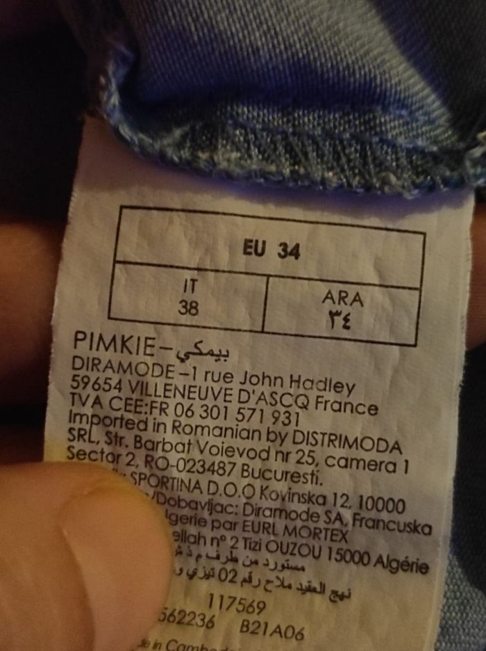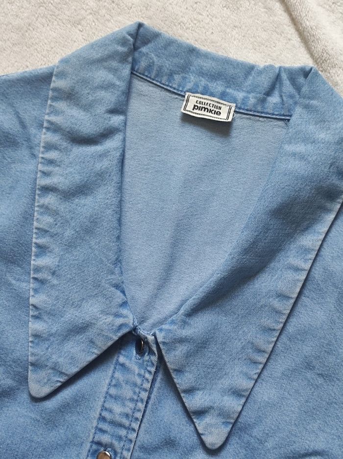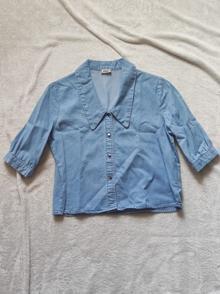 joli petit chemisier jean court et oversize à manches courtes et grand col en v replié. Fermeture à boutons. Léger et agréable à porter. 100% lyocell. Marque Pimkie en taille 34 / XS.