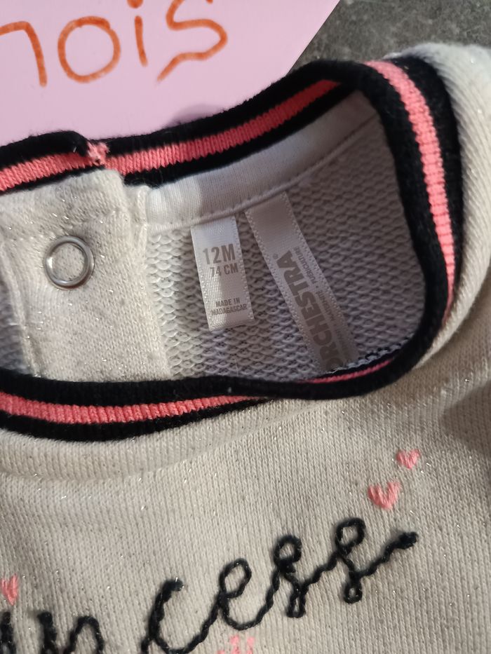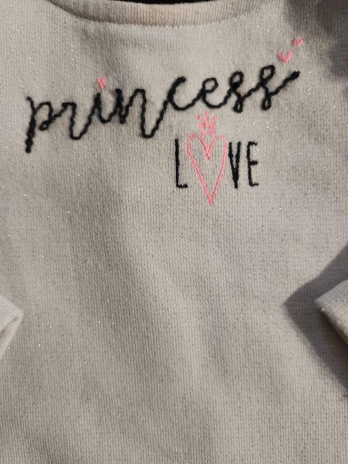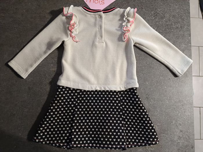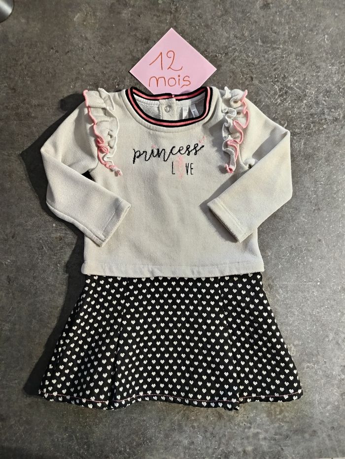 Jolie petite robe bi matière, Grise en haut avec inscription "princess love" et froufrou au niveau des épaules, Noir en bas avec des petits coeurs blancs ECXELLENT état, taille 12 mois mais taille petit donc plutôt 9 mois