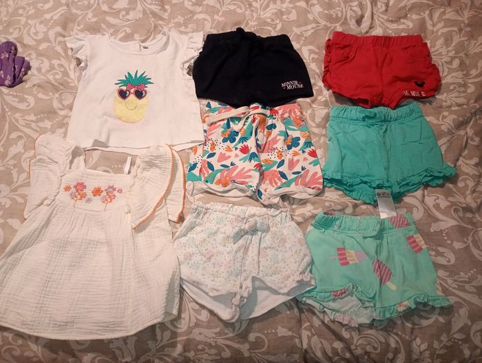 Lot bébé fille été 12 mois comprenant : - 6 shorts - 2 hauts Différentes marques : orchestra, Kiabi, gemo, Disney baby, mots d'enfants. En très bon état et 2 - 3 pièces en bon état.