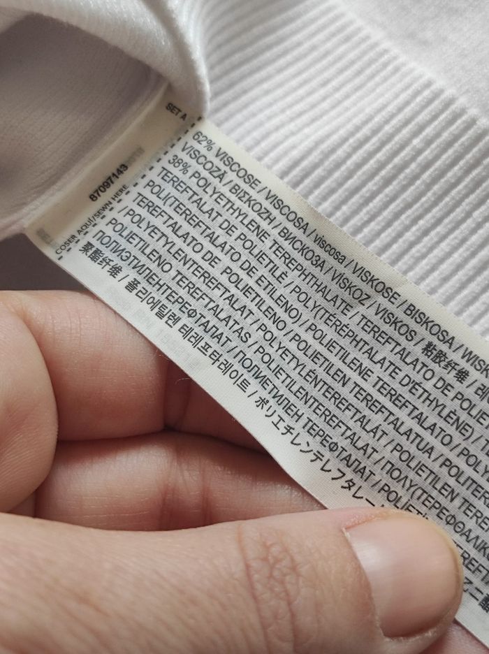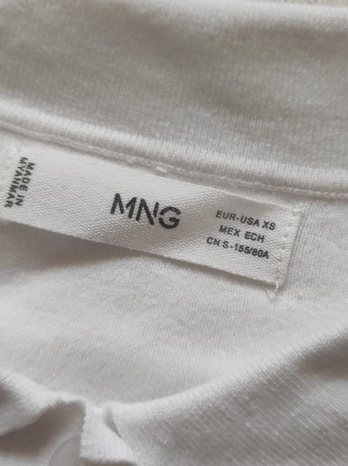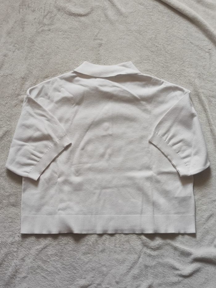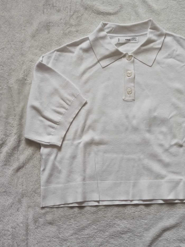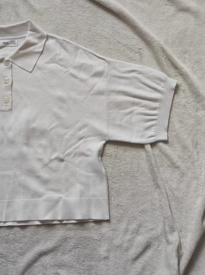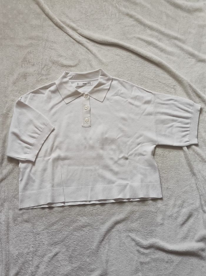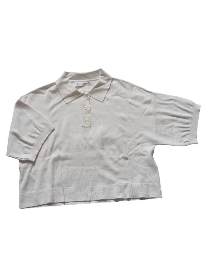 petit polo court et oversize blanc a manches courtes larges. 62% viscose et 38% polyéthylène. Marque mango en taille XS. En parfait état, ni trous tâches ou déchirures.