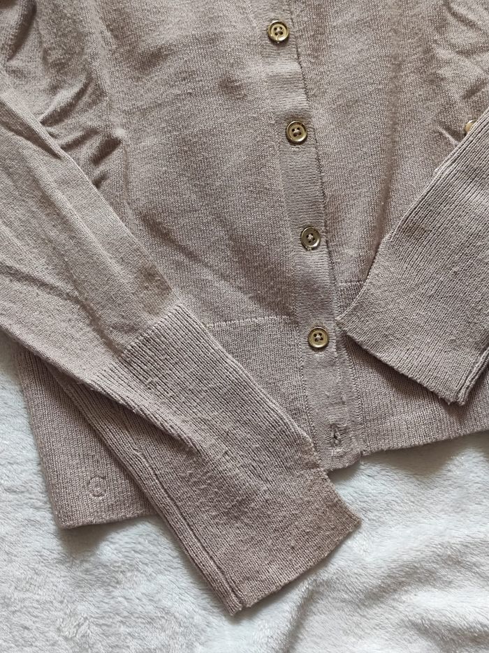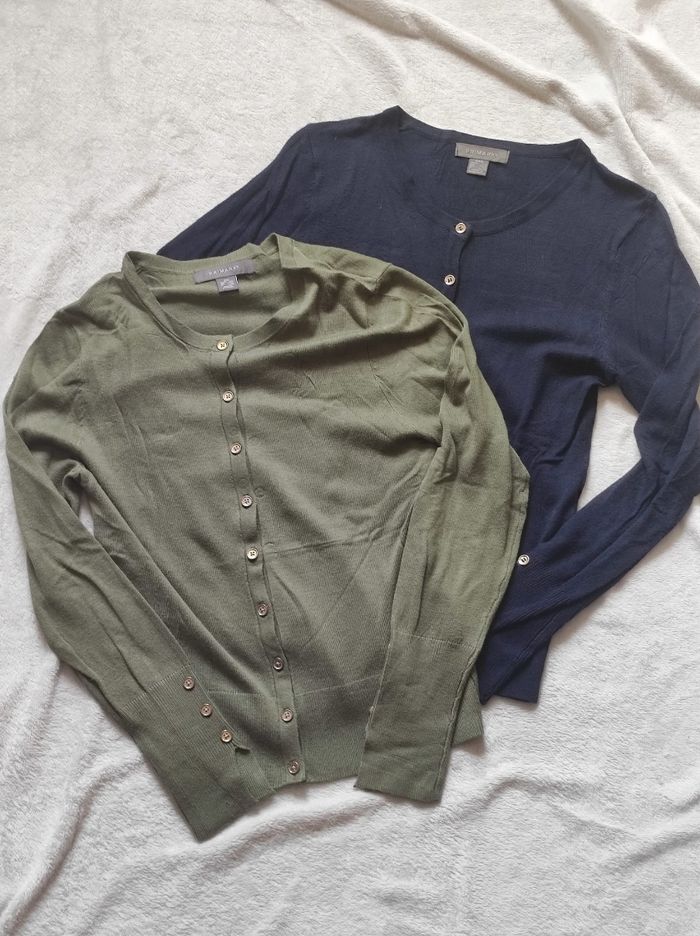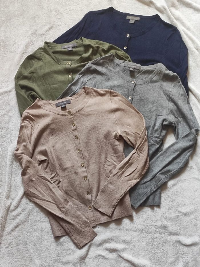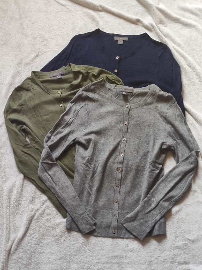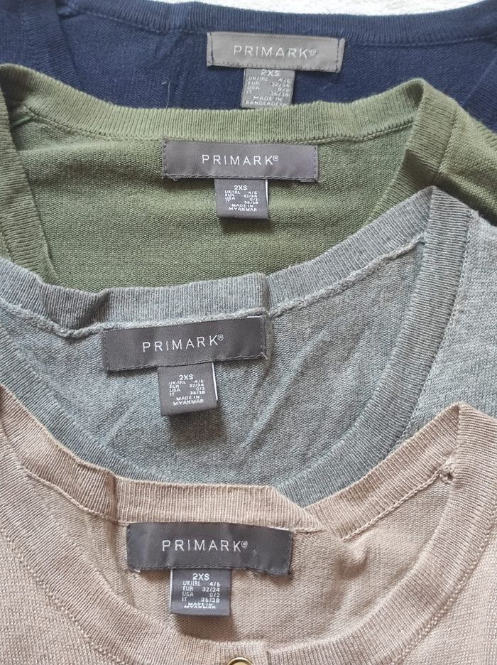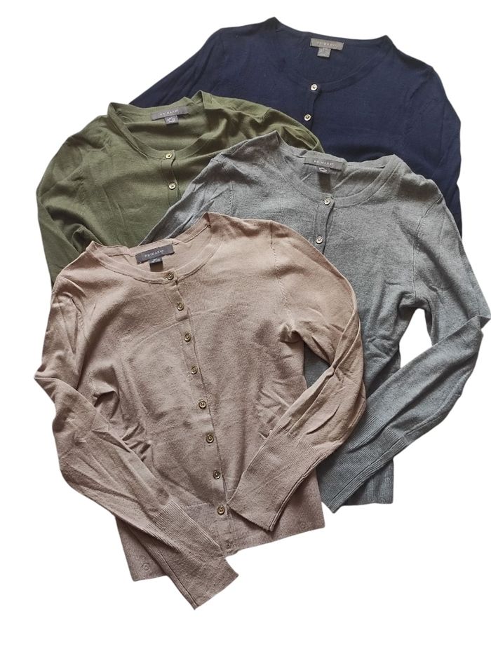 lot de 4 cardigans fin et léger avec fermeture a boutons et manches longues. 1 bleu marine ( une petite tâche rose minime sur la manche droite), 1 kaki , 1 gris et 1 camel ( état moyen plus bouloché que le reste voir la dernière photo et dernier bouton manquant). Sinon le reste est en bon état général. Marque Primark en taille XXS